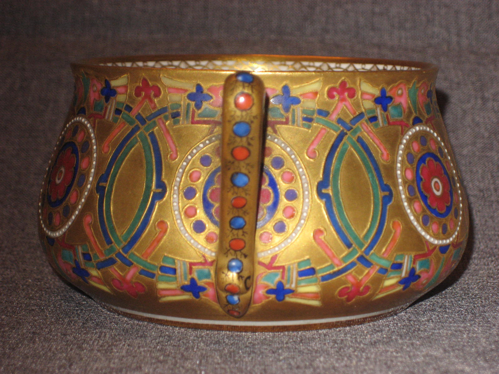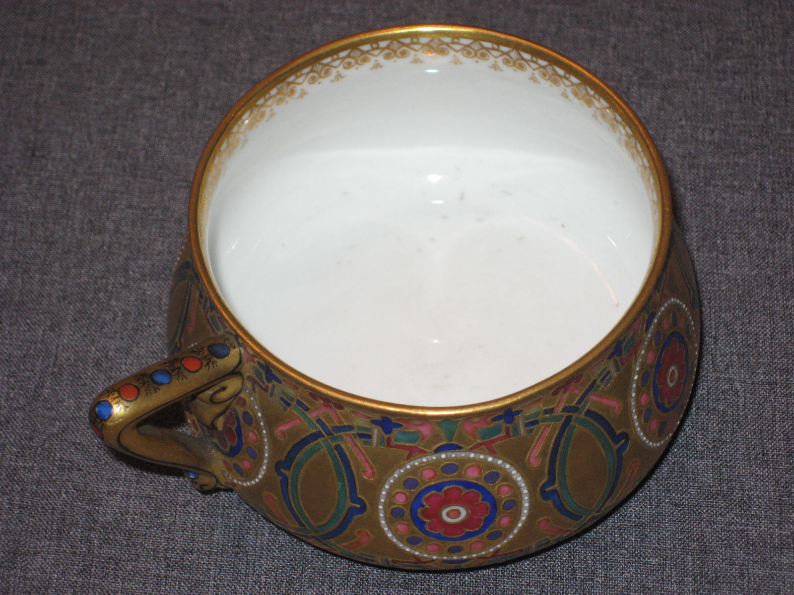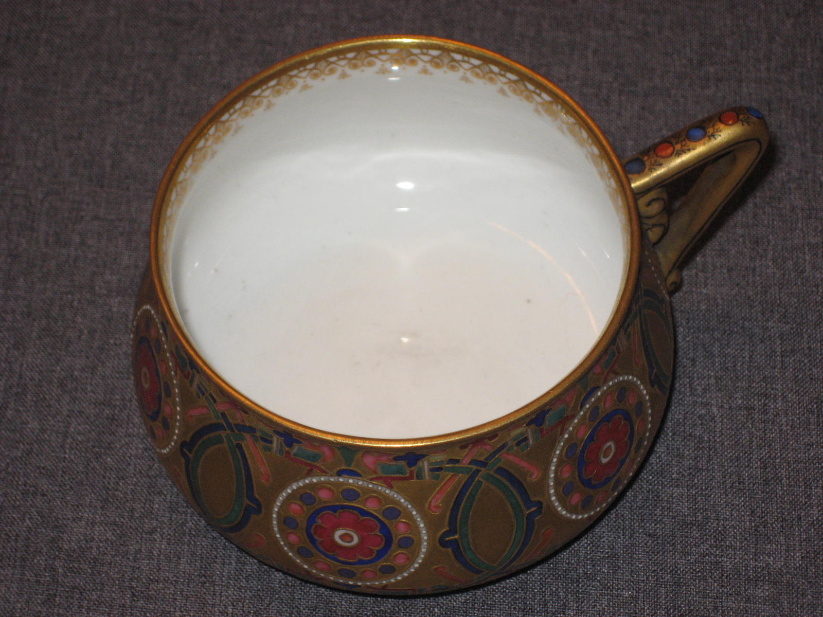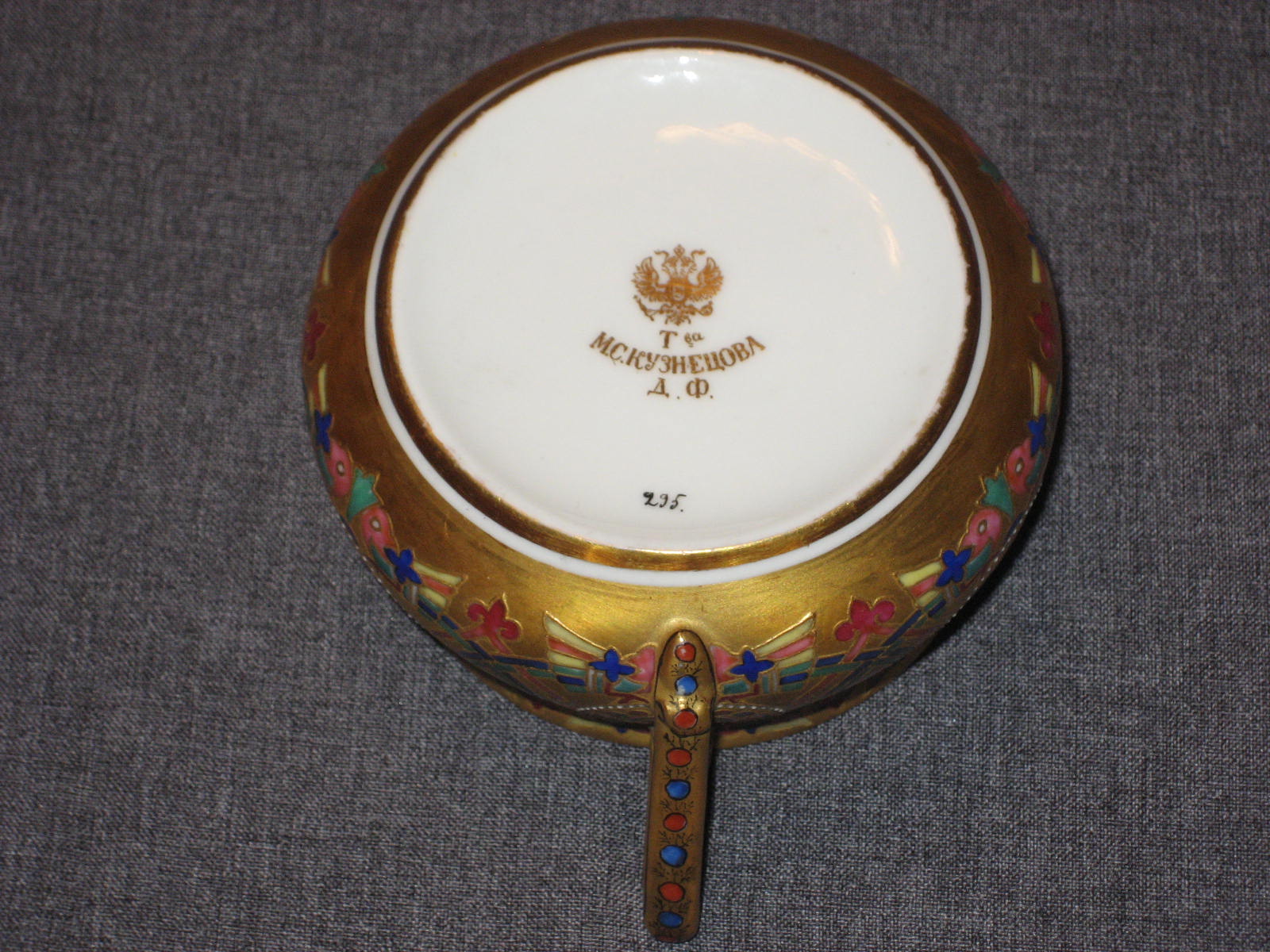 Возраст: 1892 - 1917 Годы. Страна: Российская Империя. Состояние: Отличное Техника: Эмаль перегородчатая Роспись эмалью Позолота Надглазурная роспись Материалы: Фарфор Торговые марки: Фарфоровые заводы Кузнецовых [ Российская империя ]