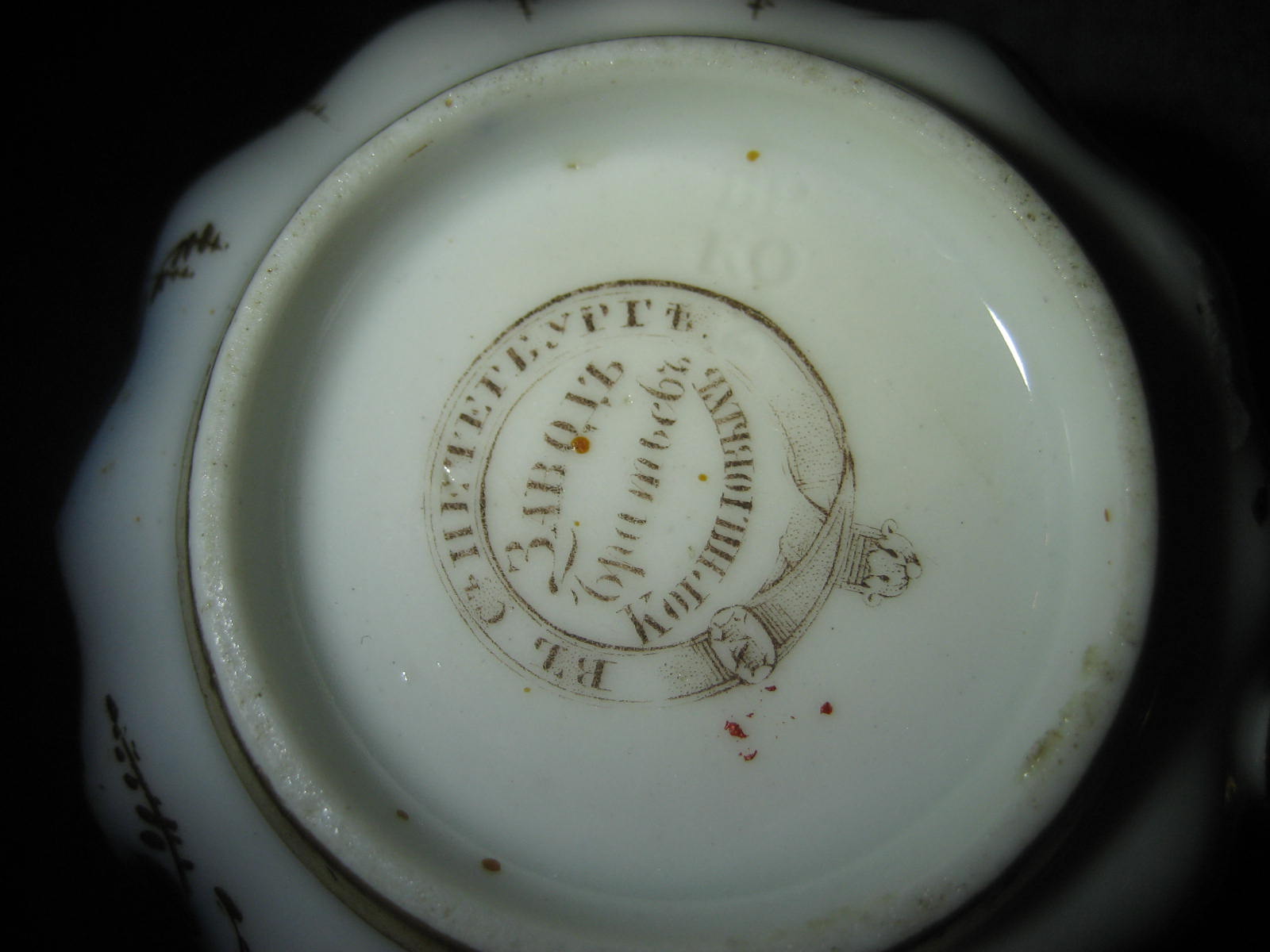 Возраст: 1835-1843 Годы. Страна: Россия. Санкт Петербург. Состояние: Отличное Техника: Надглазурная роспись Подглазурная роспись Подглазурное покрытье кобальтом Позолота Роспись золотом Роспись кобальтом Роспись красками Материалы: Фарфор Торговые марки: Фарфоровый завод Братьев Корниловых [ Российская империя ]