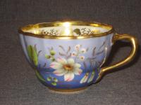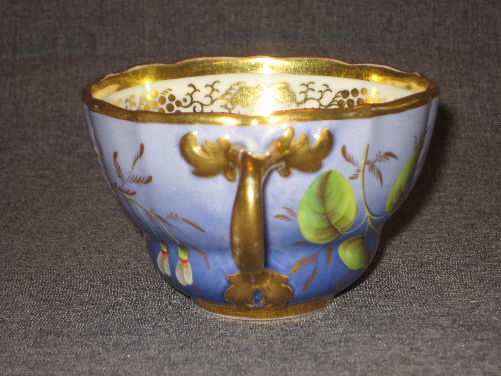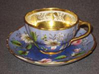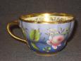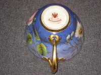 Очень редкое и очень красивое крытьё Королевского синего цвета, переходящего в фиалковый цвет. Внутри чашки шикарная позолота до самого низа с росписью золотом в верхней части. Чашка находится в превосходном состоянии. Нет ни сколов, ни трещин, ни реставраций. Даже потёртости совершенно мизерные. На тыльной стороне блюдца присутствует маленькая волосяная трещинка на глазури длиной приблизительно 2,7 см. При этом на фасадной стороне блюдца этой трещинки я не увидел даже под очень хорошим освещением мощным фонариком (смотрите последнюю фотографию).