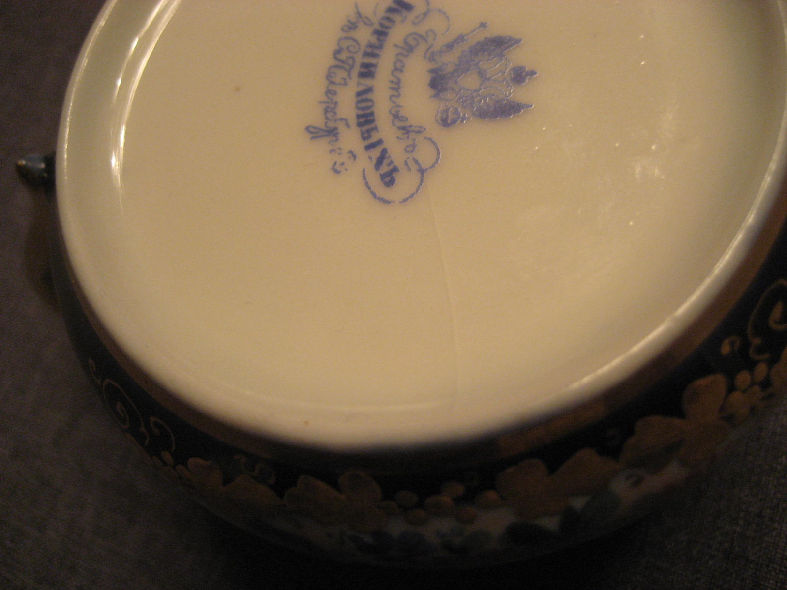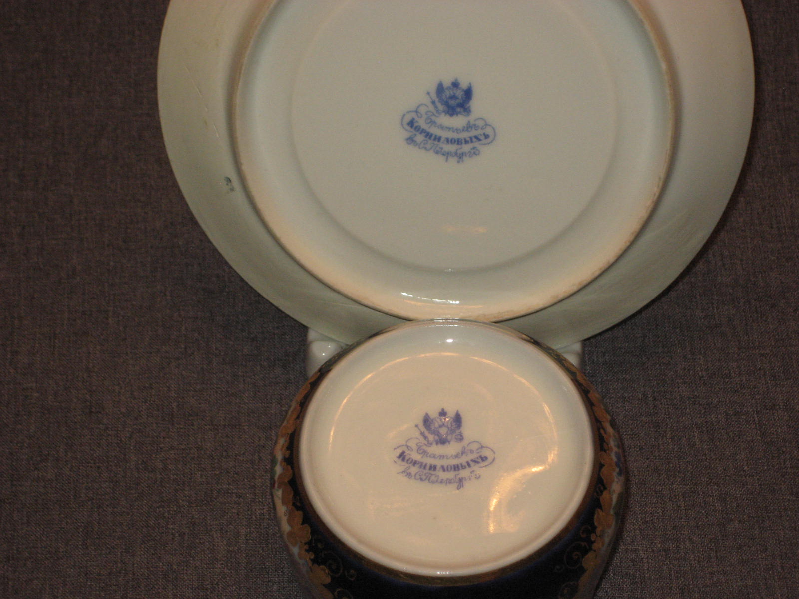 Возраст: 1861 - 1884 Годы. Страна: Российская Империя. Санкт-Петербург. Состояние: Нормальное Техника: Надглазурная роспись Подглазурное покрытье кобальтом Позолота Роспись золотом Материалы: Фарфор Торговые марки: Фарфоровый завод Братьев Корниловых [ Российская империя ][Посмотреть все предметы этого завода]