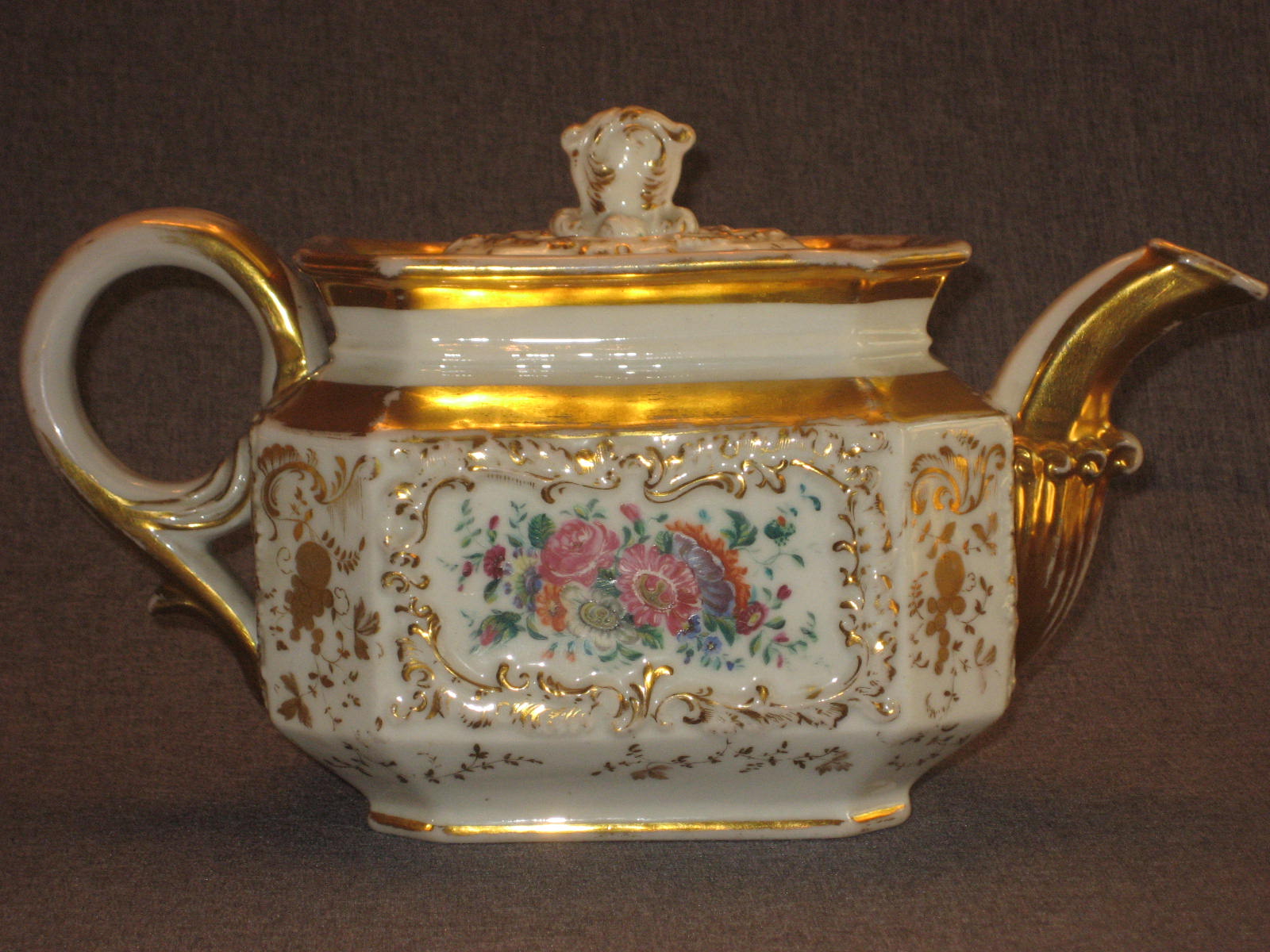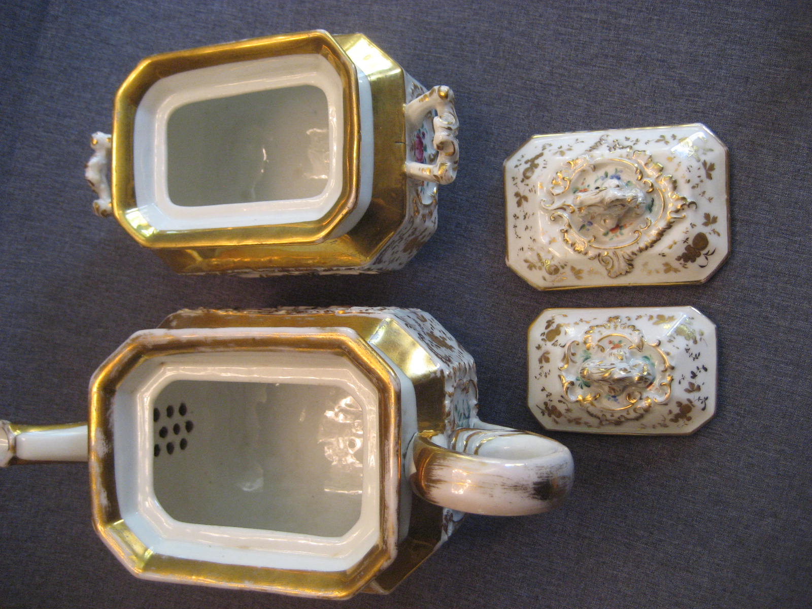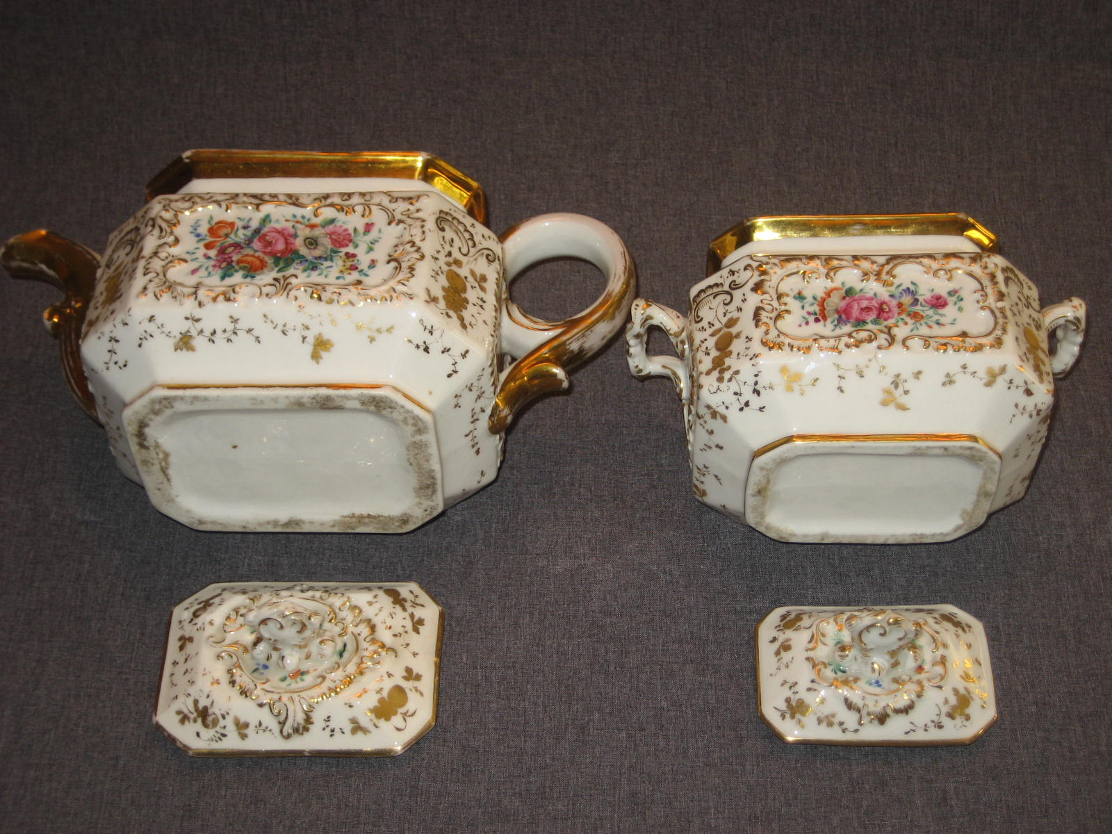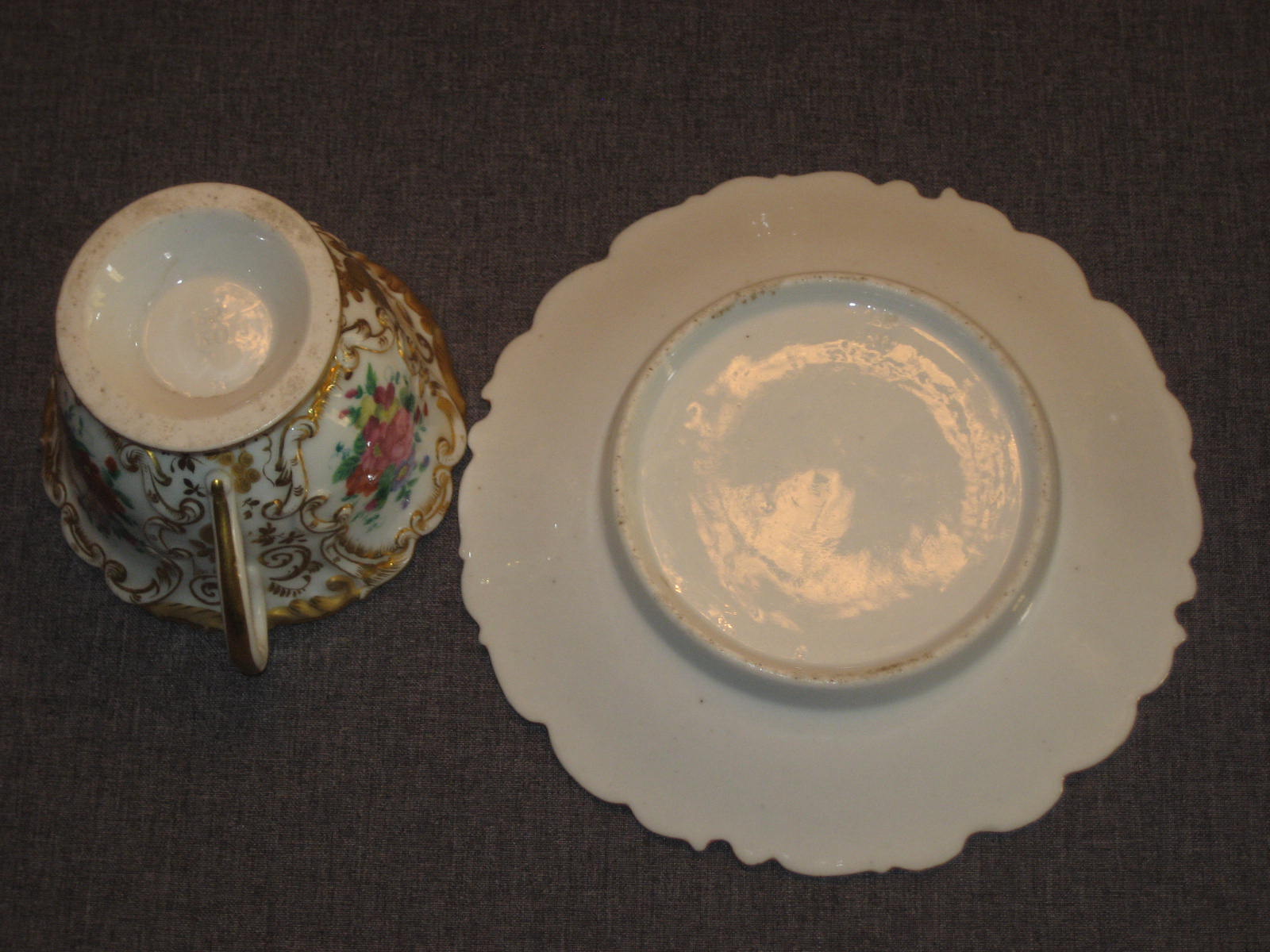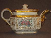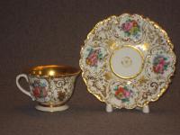 Часть чайного сервиза. Состояние прекрасное. Дефектов нет никаких кроме заводских (обжиговых). Совсем мизерные потертости позолоты. На всех предметах стоят марка в тесте "БР.КО". То есть годы производства 1835-1843. Возможно, что это один из первых сервизов, произведённых на заводе Братьев Корниловых.