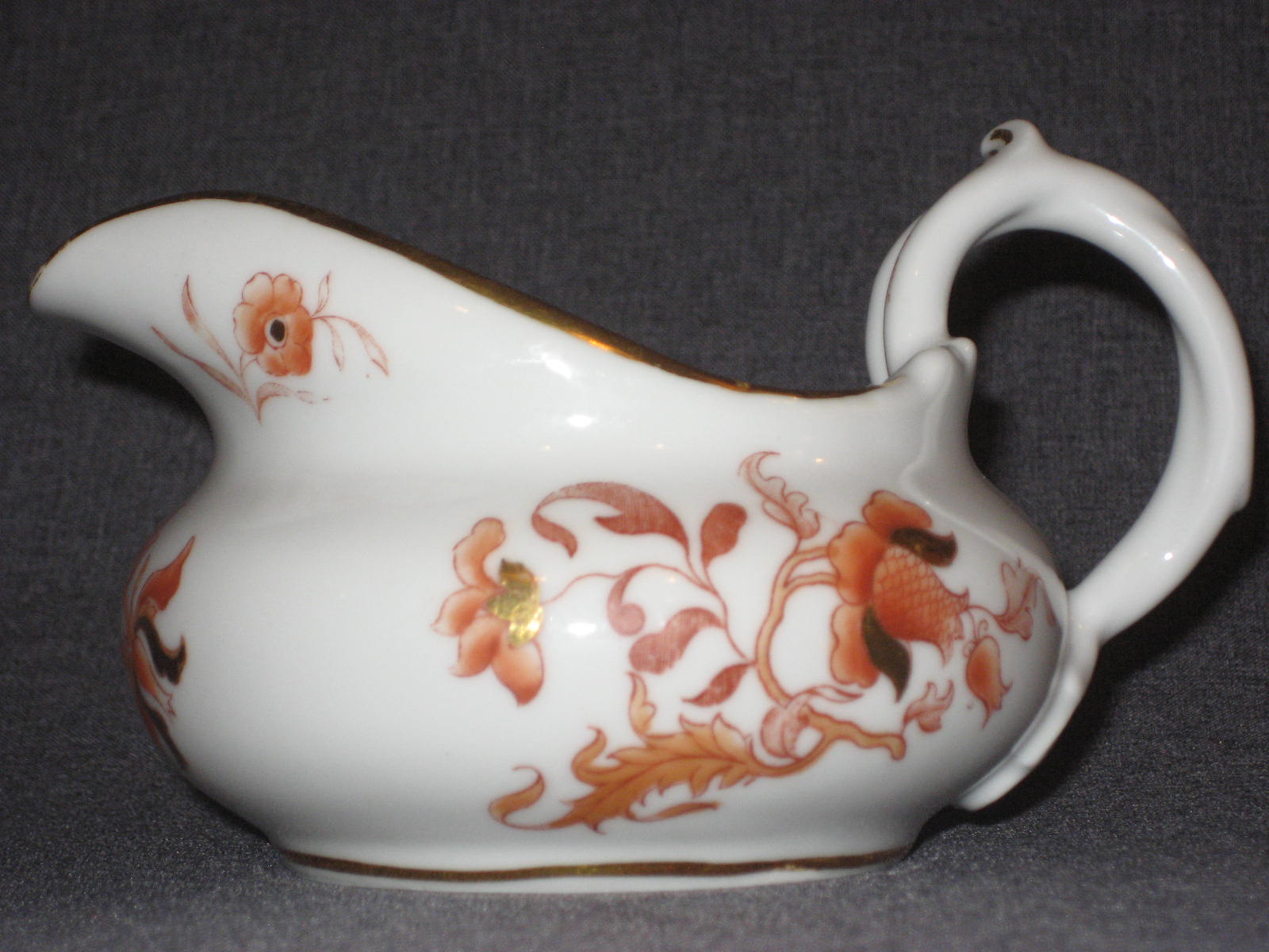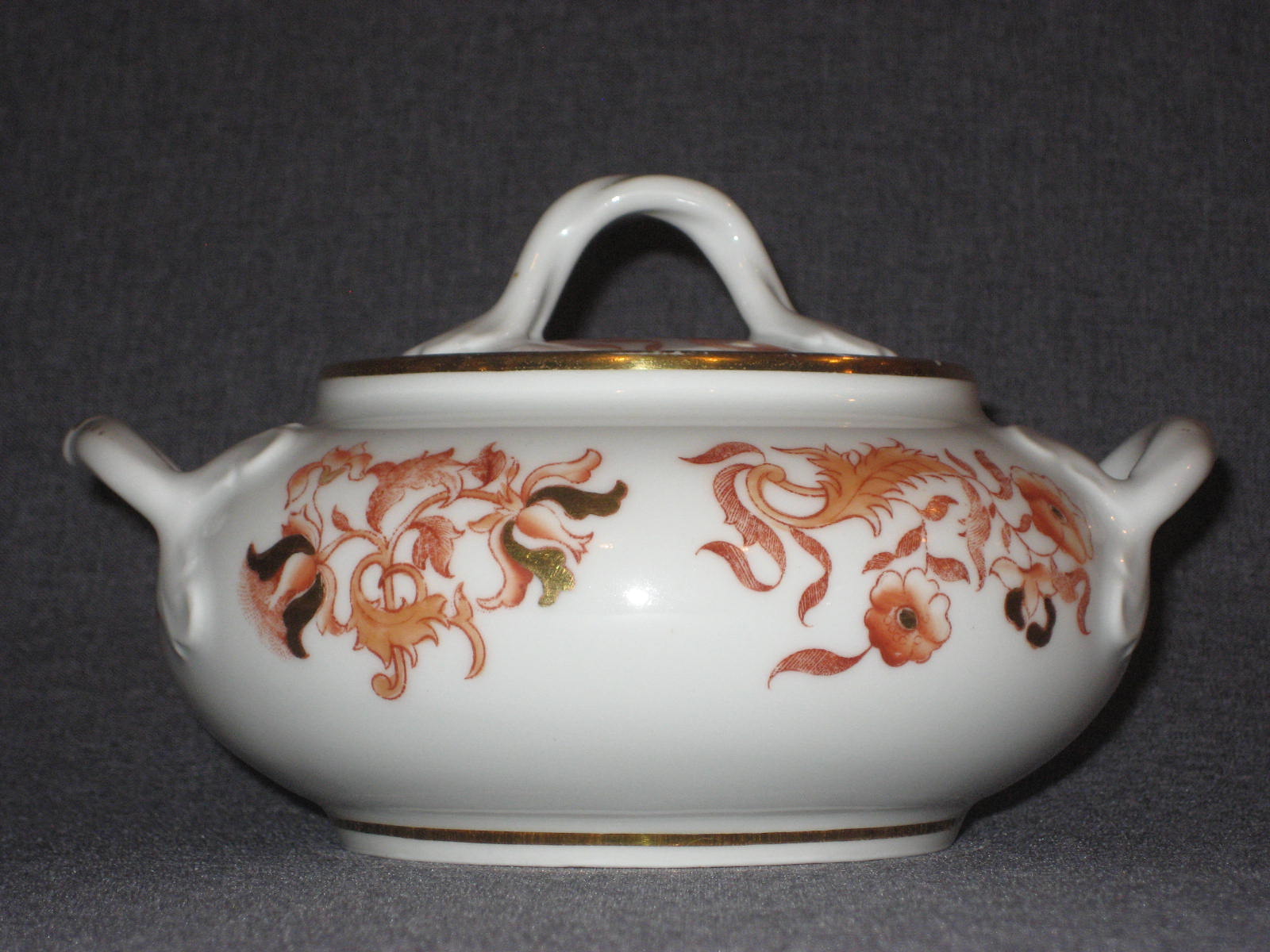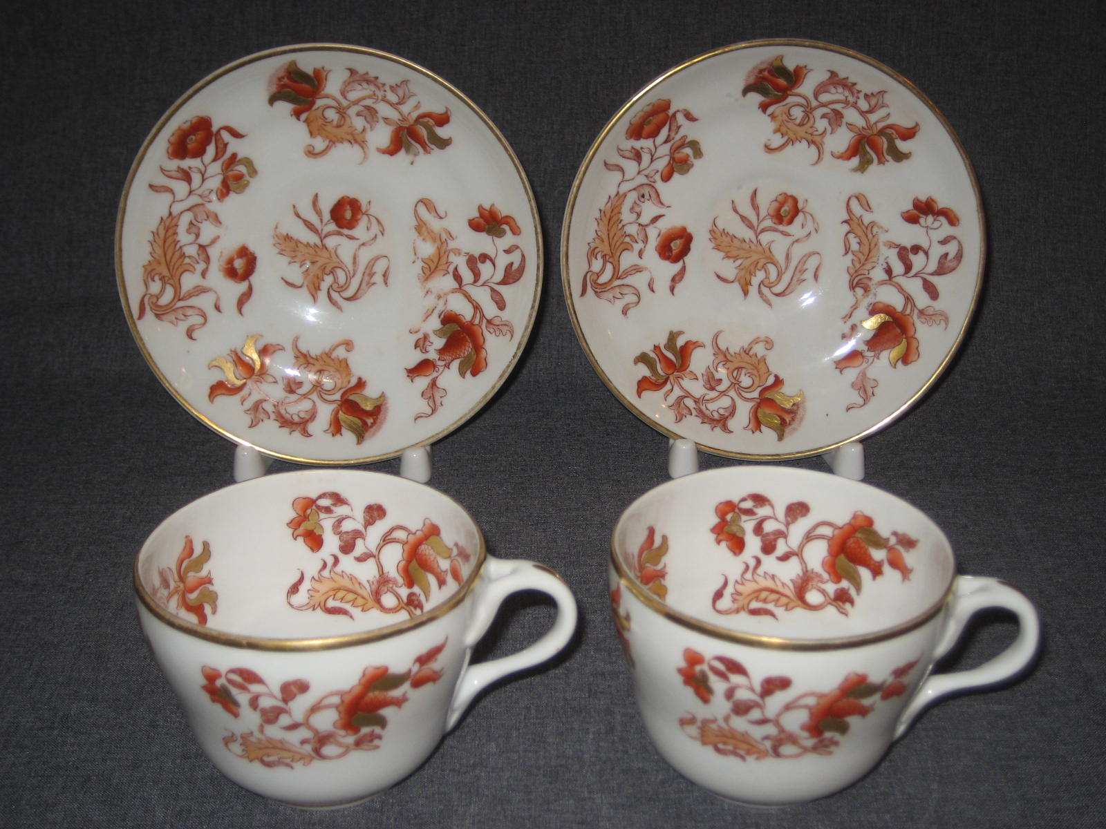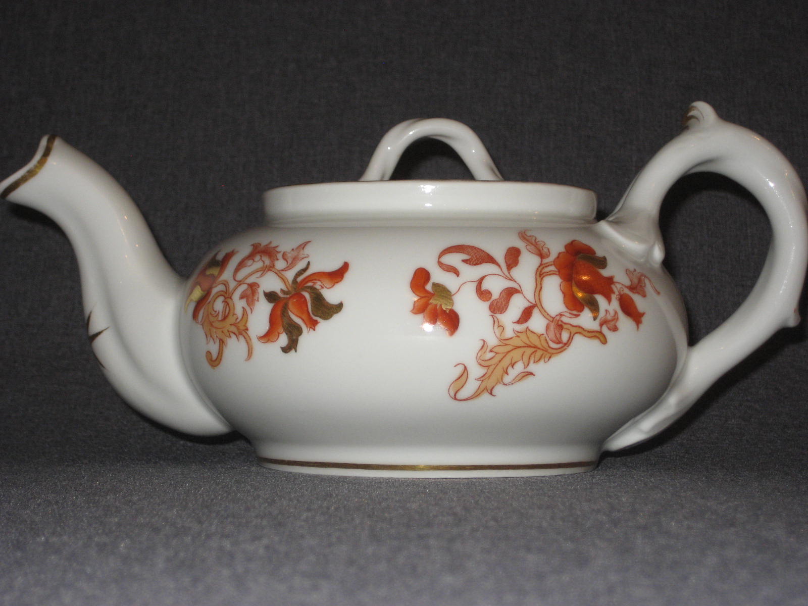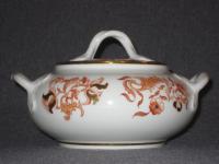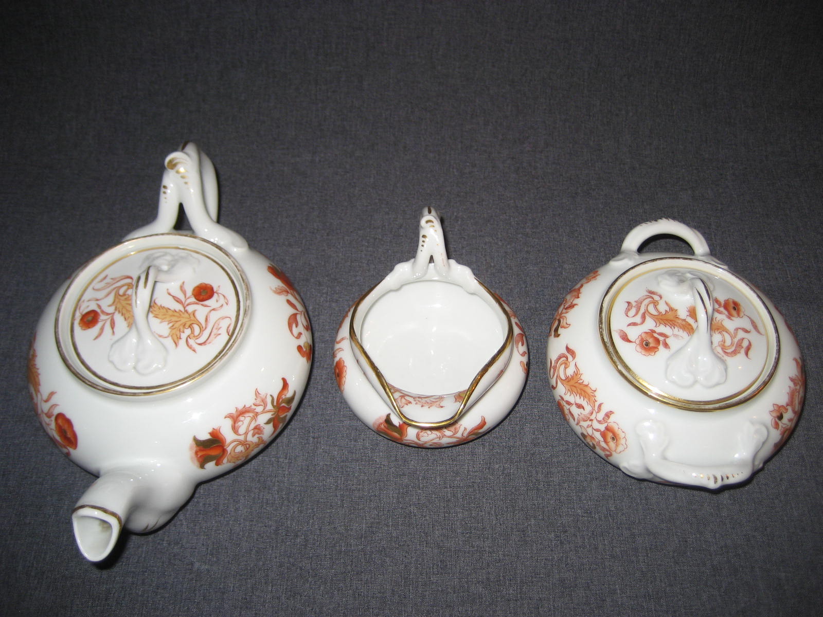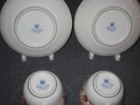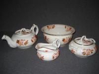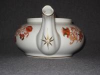 Стилизованные цветы. Печать надглазурная монохромная. Роспись надглазурная полихромная. Позолота. Прекрасное состояние. На крышке и носике чайника присутствуют по одному маленькому сколу (2х2 мм. и 3х3 мм. соответственно). Остальные предметы находятся в идеальном состоянии.