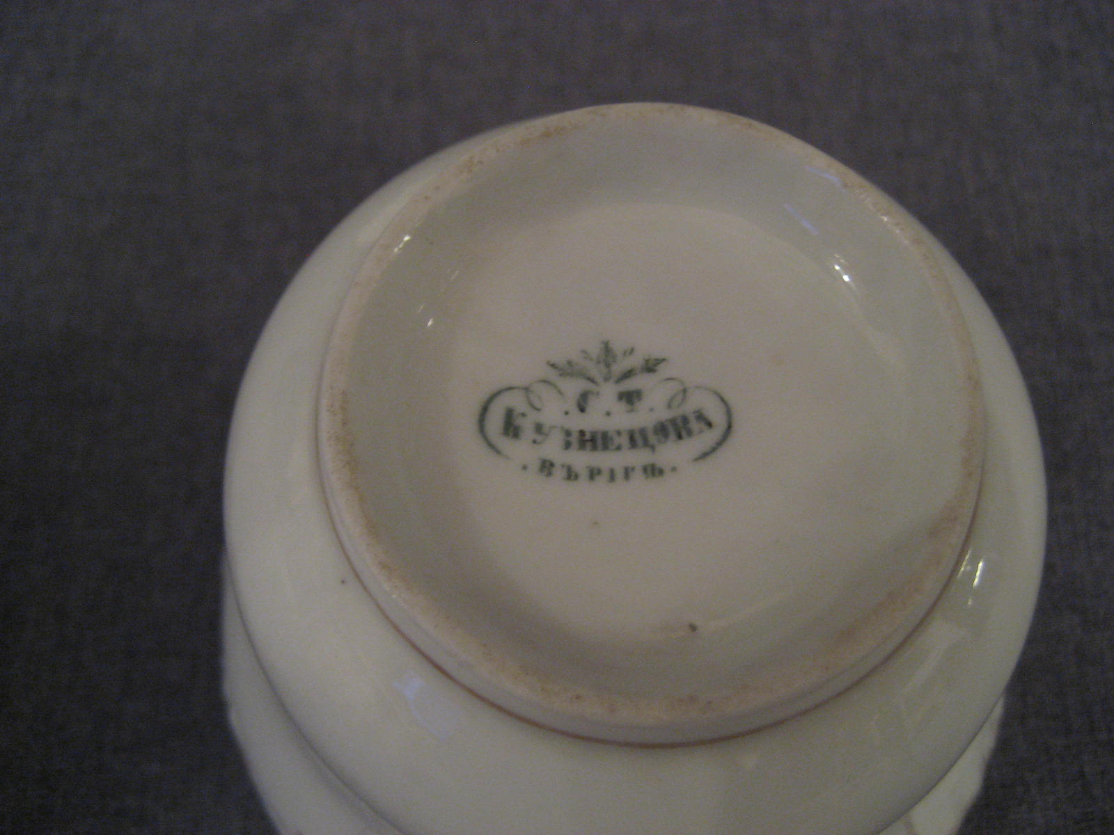 Возраст: 1842 - 1864 гг. Страна: Российская Империя. Состояние: Отличное Техника: Роспись золотом Материалы: Фарфор Торговые марки: Фарфоровые заводы Кузнецовых [ Российская империя ][Посмотреть все предметы этого завода]