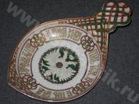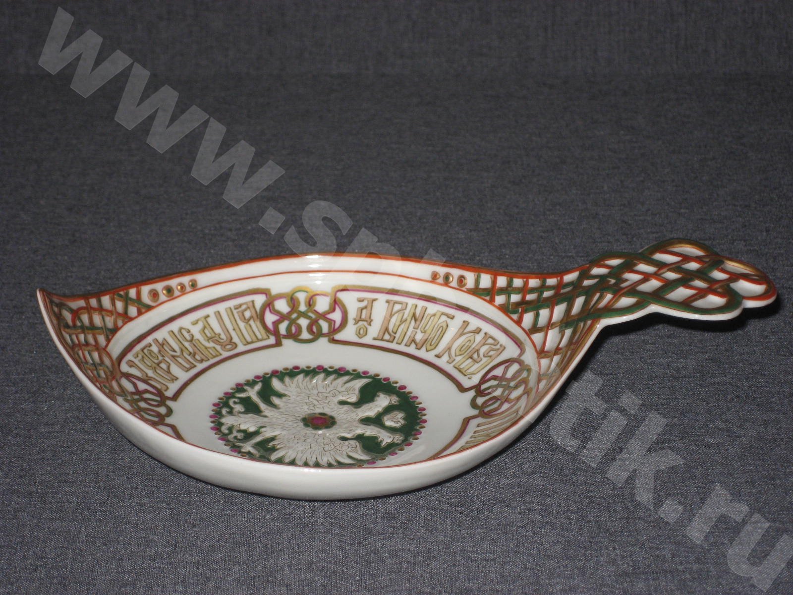 Ковш с гербом России и пословицей: "Затрогалась душа до винного ковша. Пить горе,а не пить вдвое." Печать надглазурная полихромная. Позолота. Герб и орнамент рельефные. Состояние идеальное! Дефектов нет никаких. По Вашему запросу вышлем Вам дополнительные фотографии.
