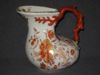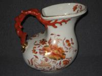 Кувшин в форме античного аска с ручкой в форме коралла. Прекрасное состояние. Стилизованные цветы. Печать надглазурная монохромная, роспись надглазурная полихромная, позолота. По декору полностью соответствует чайному сервизу номер 255. Небольшие потёртости позолоты. При необходимости вышлю Вам дополнительные фотографии.
