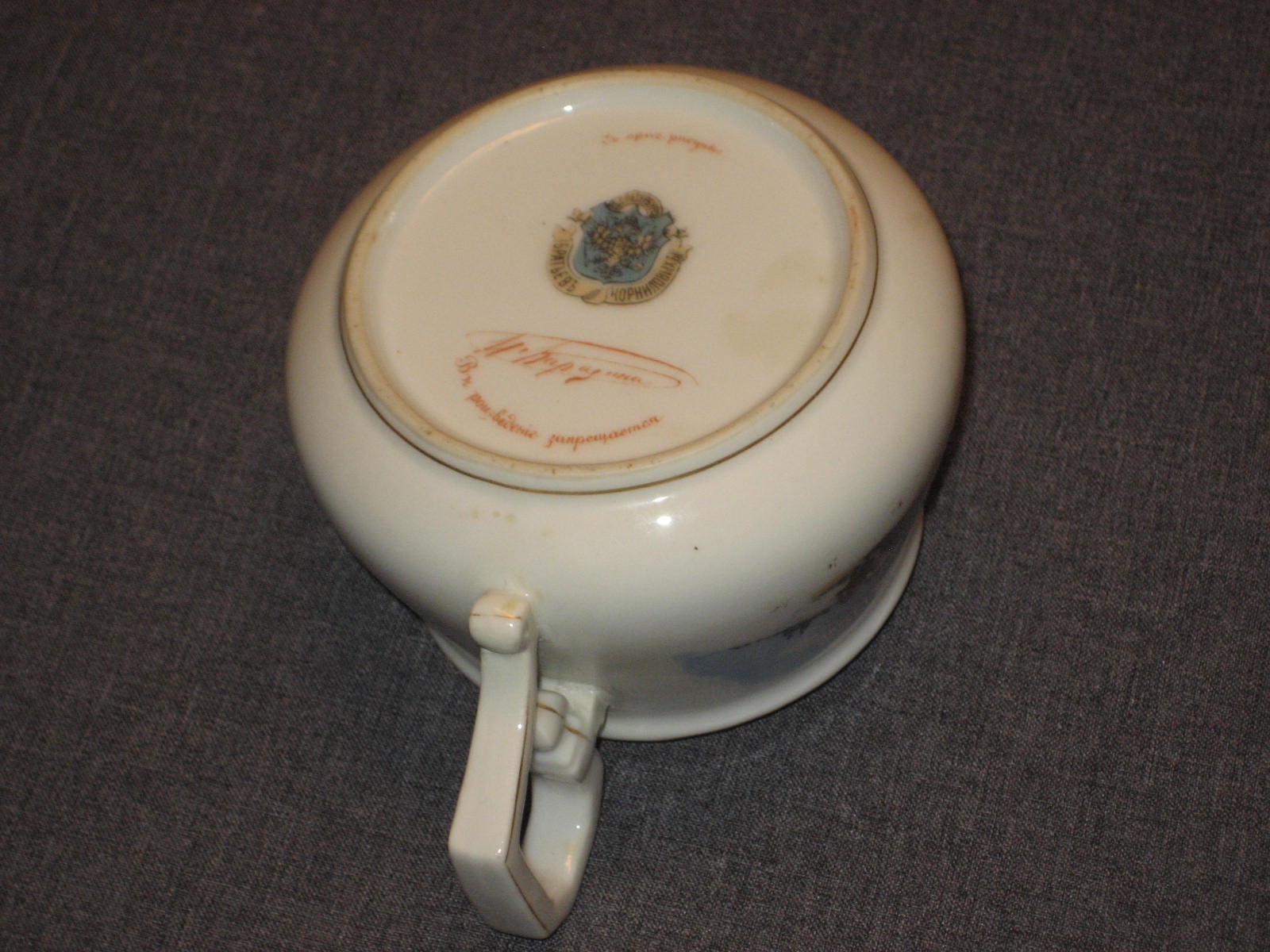Возраст: 1894 - 1917 годы. Страна: Российская Империя. Санкт-Петербург. Состояние: Отличное Техника: Печать надглазурная полихромная . Позолота Роспись золотом Материалы: Фарфор Торговые марки: Фарфоровый завод Братьев Корниловых [ Российская империя ][Посмотреть все предметы этого завода]