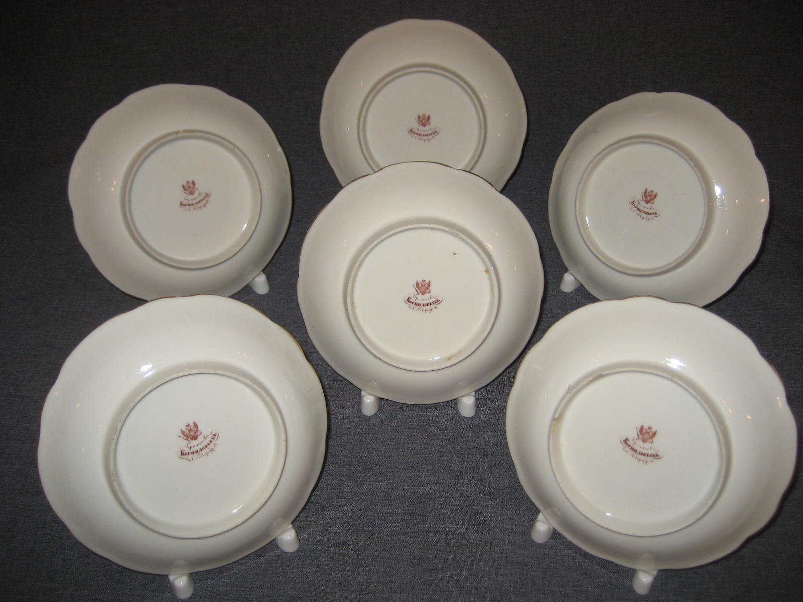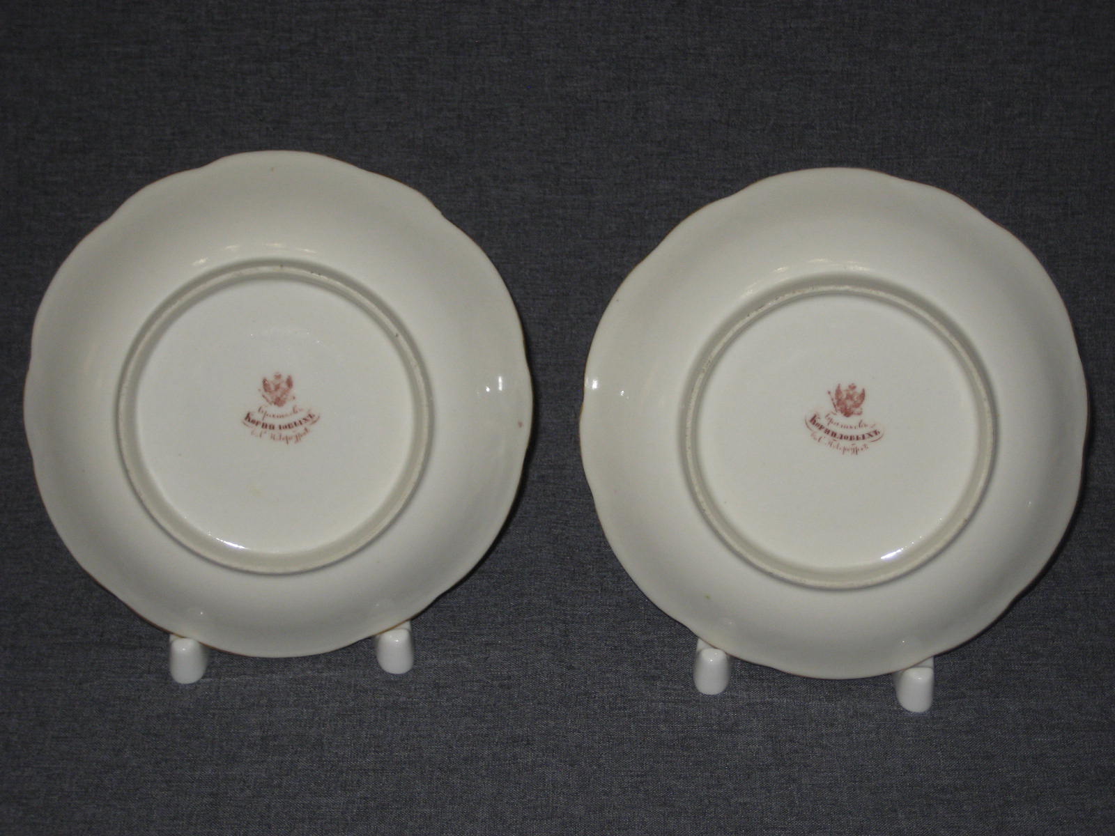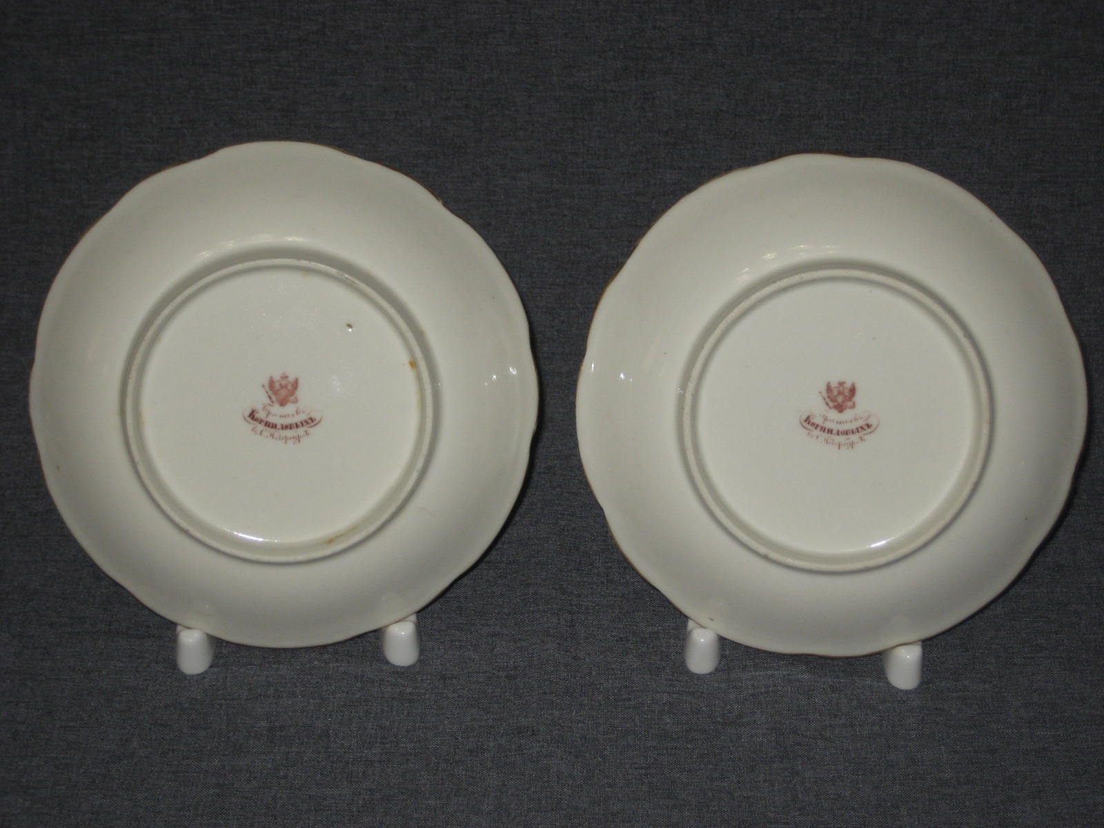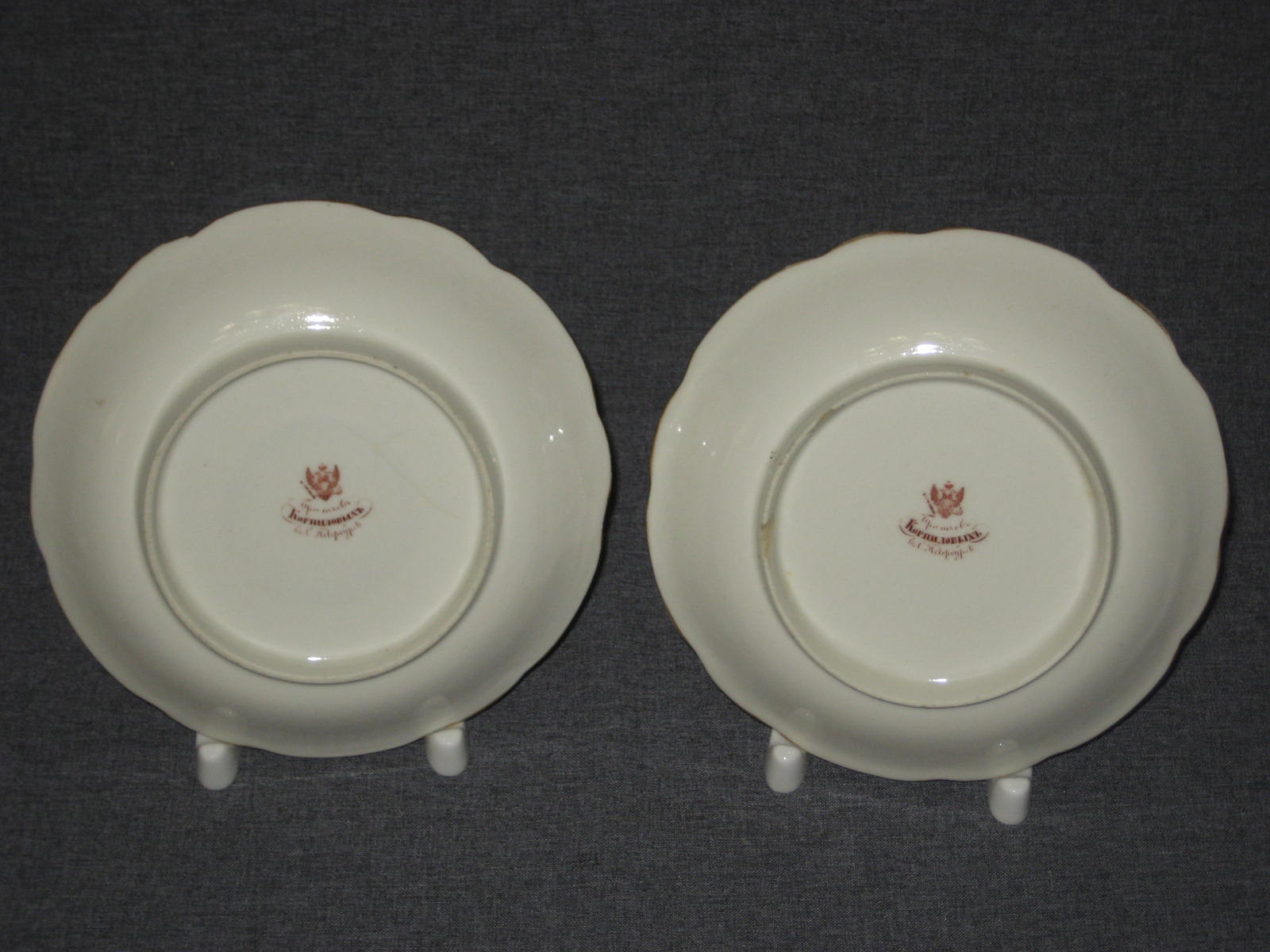 Очень красивые блюдца в прекрасном состоянии. Из дефектов только небольшие потёртости и два скола на тыльной части (ободе) одного из блюдец (смотрите последнее фото). Других дефектов нет никаких. По Вашему запросу вышлем Вам дополнительные фотографии.
