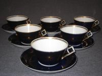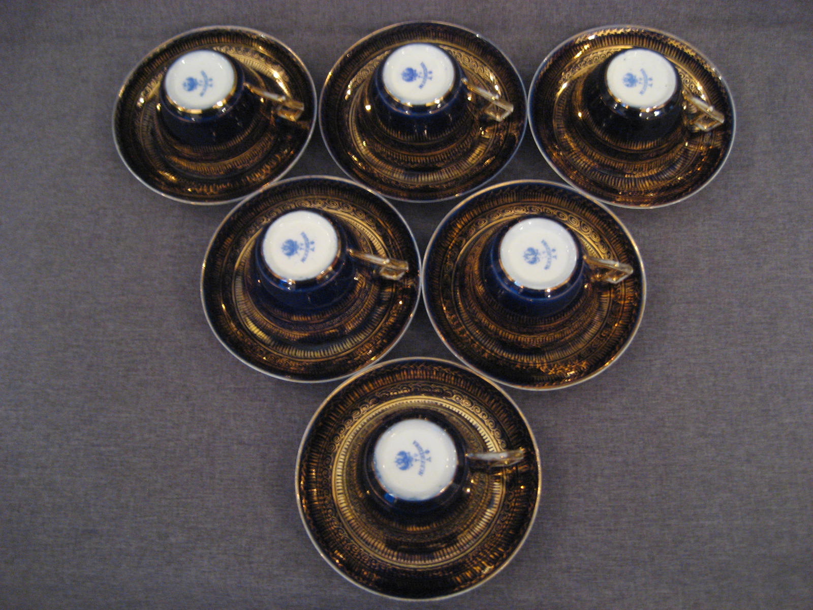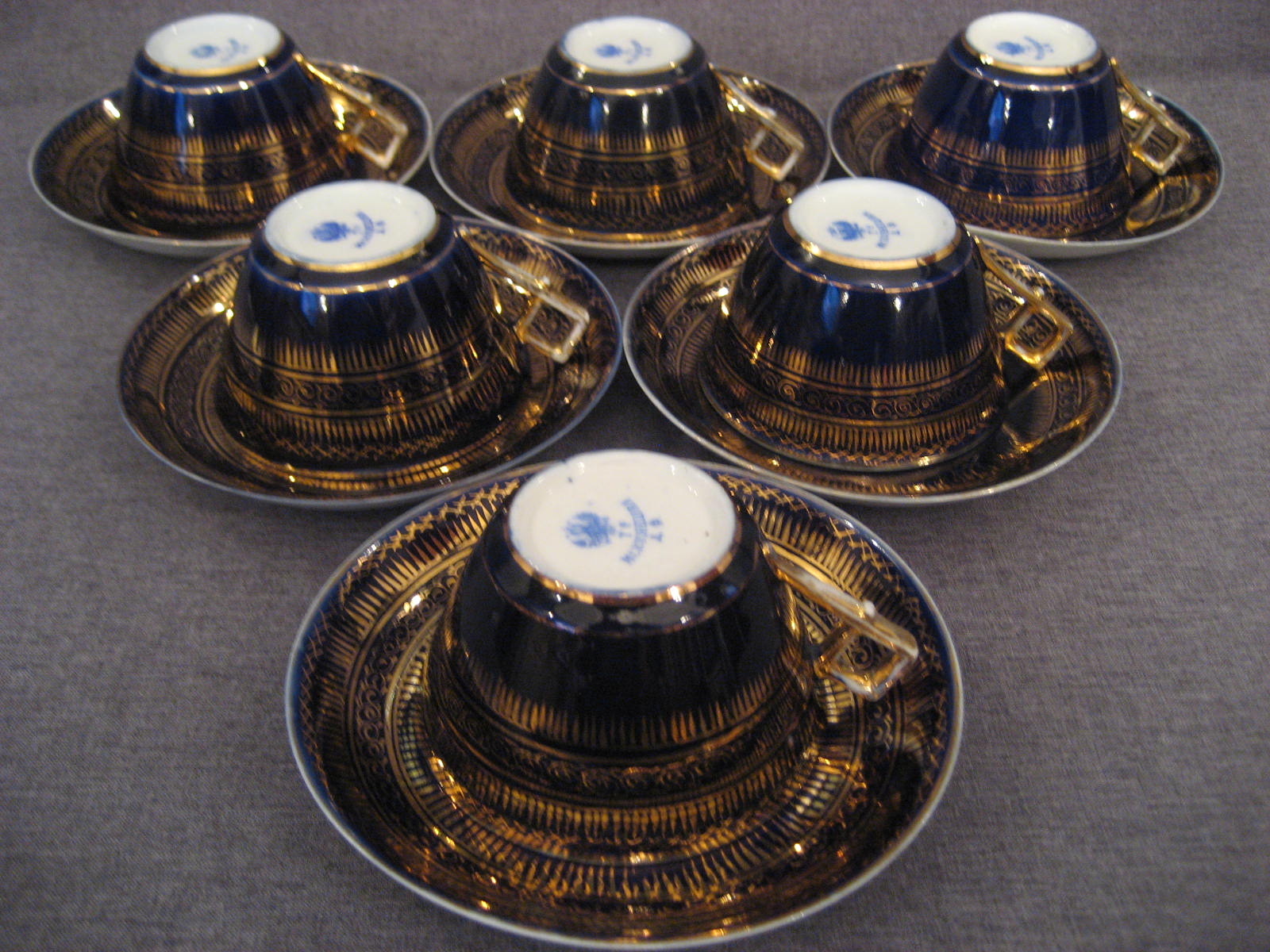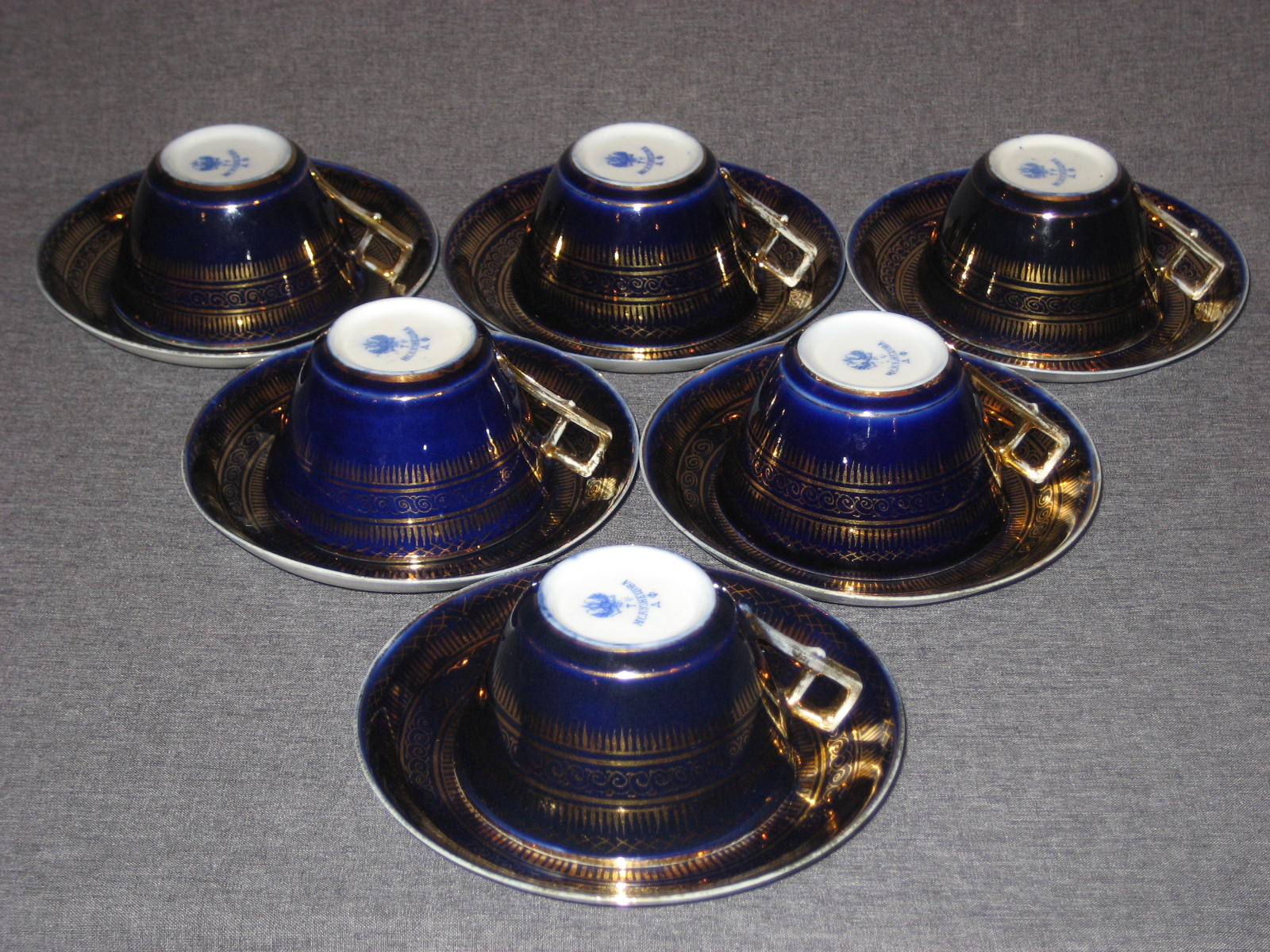 Комплект из шести чашек в Русском стиле с блюдцами для любителей кобальта с золотом! Дмитровская фабрика товарищества М.С. Кузнецова. Много кобальта и много позолоты. Состояние отличное. Дефектов нет никаких. Нет ни сколов, ни трещин, ни реставраций.Только потёртости позолоты на ручках чашек и небольшие потёртости на блюдцах.
