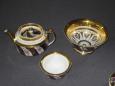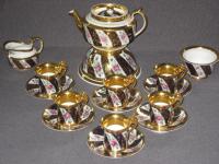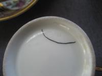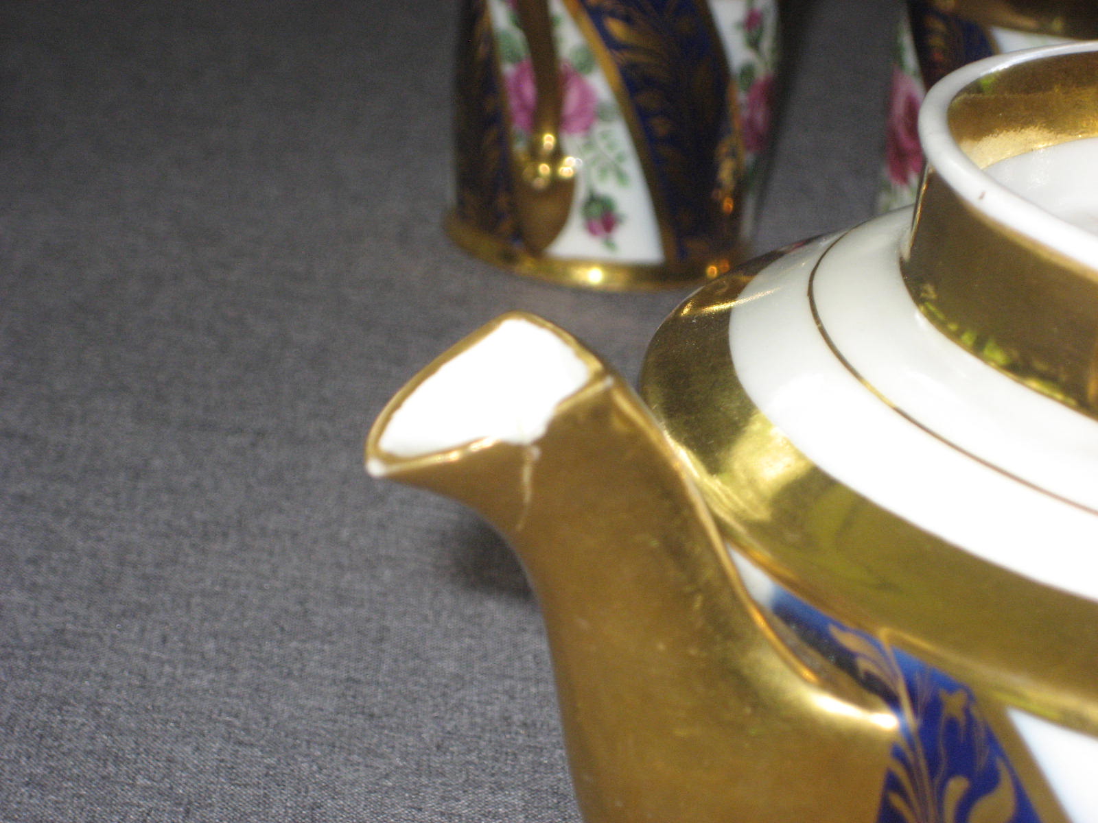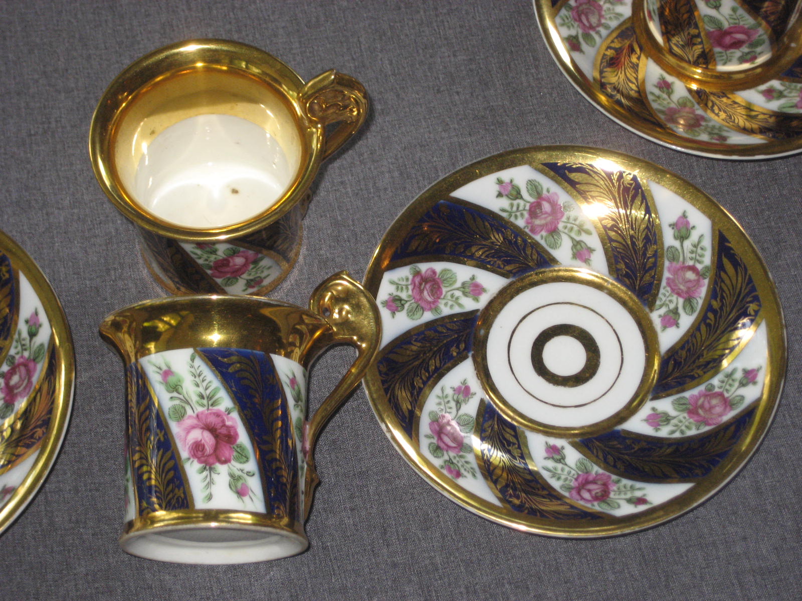 Склеено одно блюдце (маленький сегмент). Есть маленький скол на ручке (невидимой части) молочника, на носике чайника и на крышке чайника. Отсутствует крышка сахарницы, но в те времена существовали сахарницы без крышек. Возможно, это норма. В остальном состояние идеальное. Позолота на всех частях сервиза находится в идеальном состоянии, что является большой редкостью для изделий фабрики Купца Батенина, сохранившихся до наших дней. По Вашему запросу вышлем Вам дополнительные фотографии.