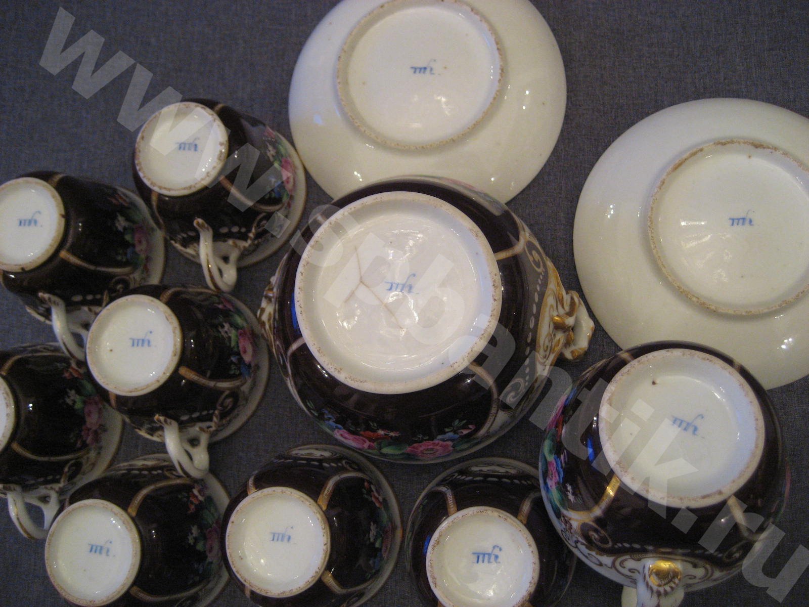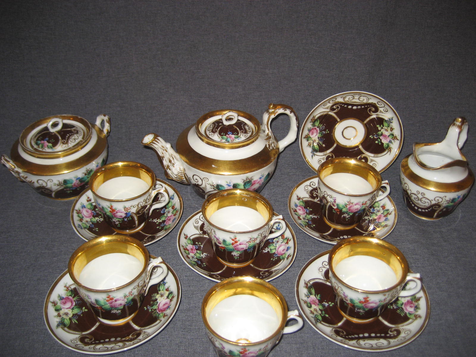 Полный чайный сервиз на шесть персон. На носике чайника скол и от него идет вдоль носика несквозная трещина. На дне сахарницы паук. В остальном состояние идеальное. Все чайные пары находятся в отличном состоянии. Живописное заведение Тимофея Кудинова отличалось очень высоким качеством росписи фарфора.