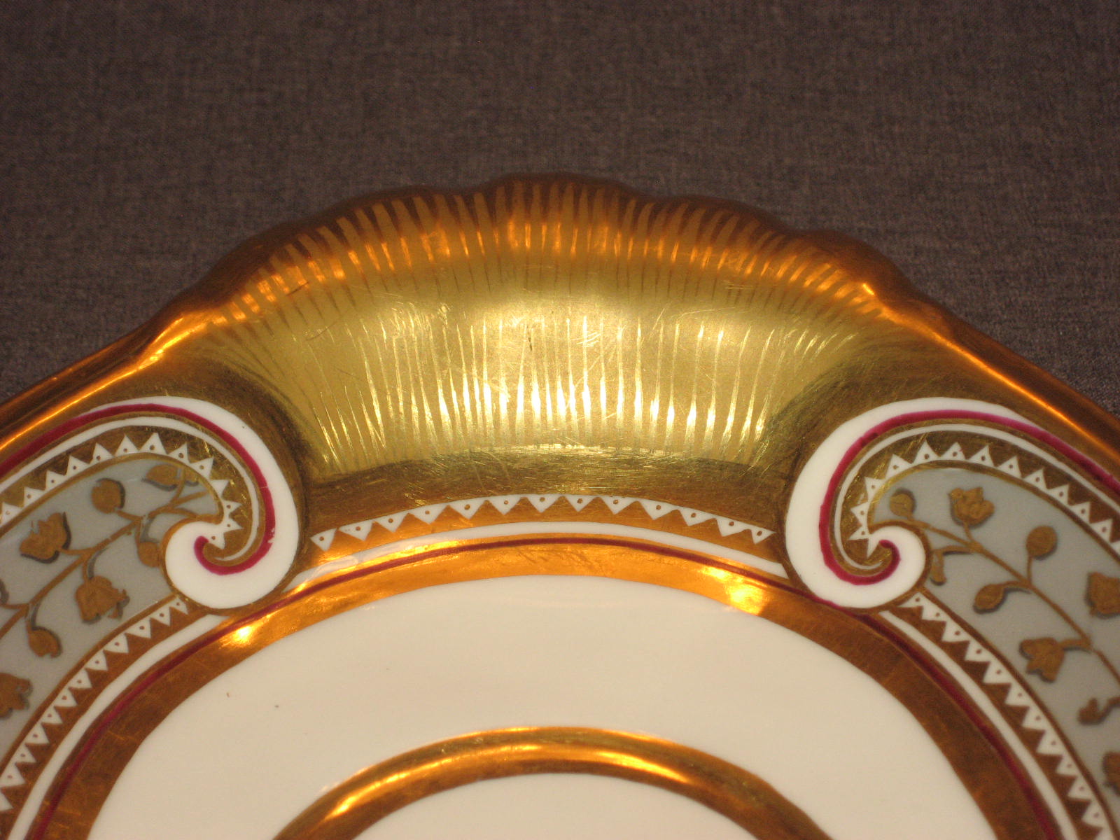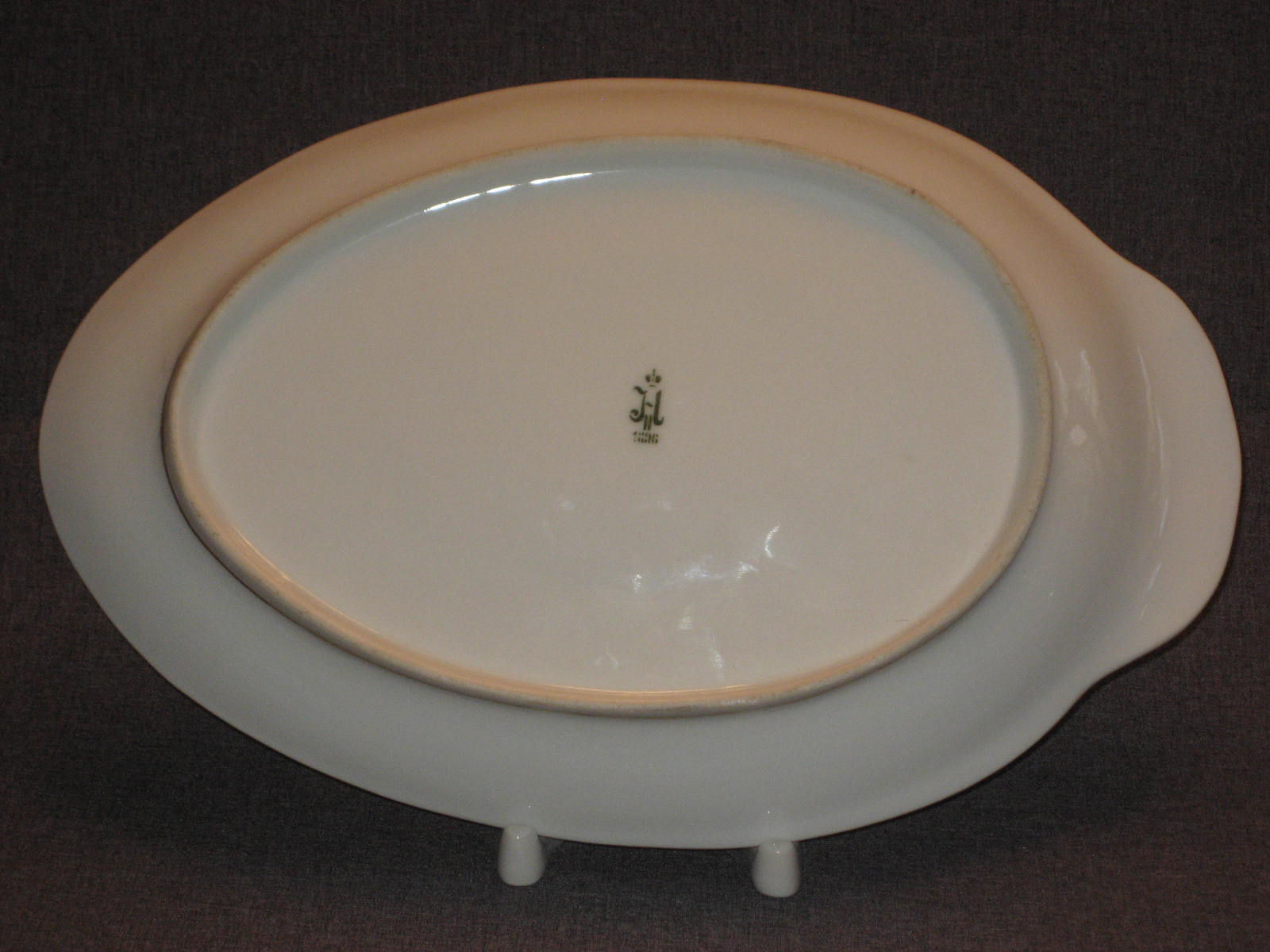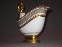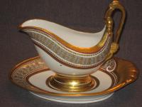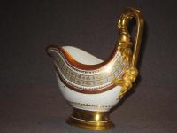 Соусник на поддоне из Бабигонского сервиза ИФЗ. Соусник не маркирован, что позволяет отнести его к основному составу сервиза (1824-ый год). Период правления Императора Александра Первого. Поддон из второго периода дополнений (1894-1917 годы). Период правления Императора Николая Второго.