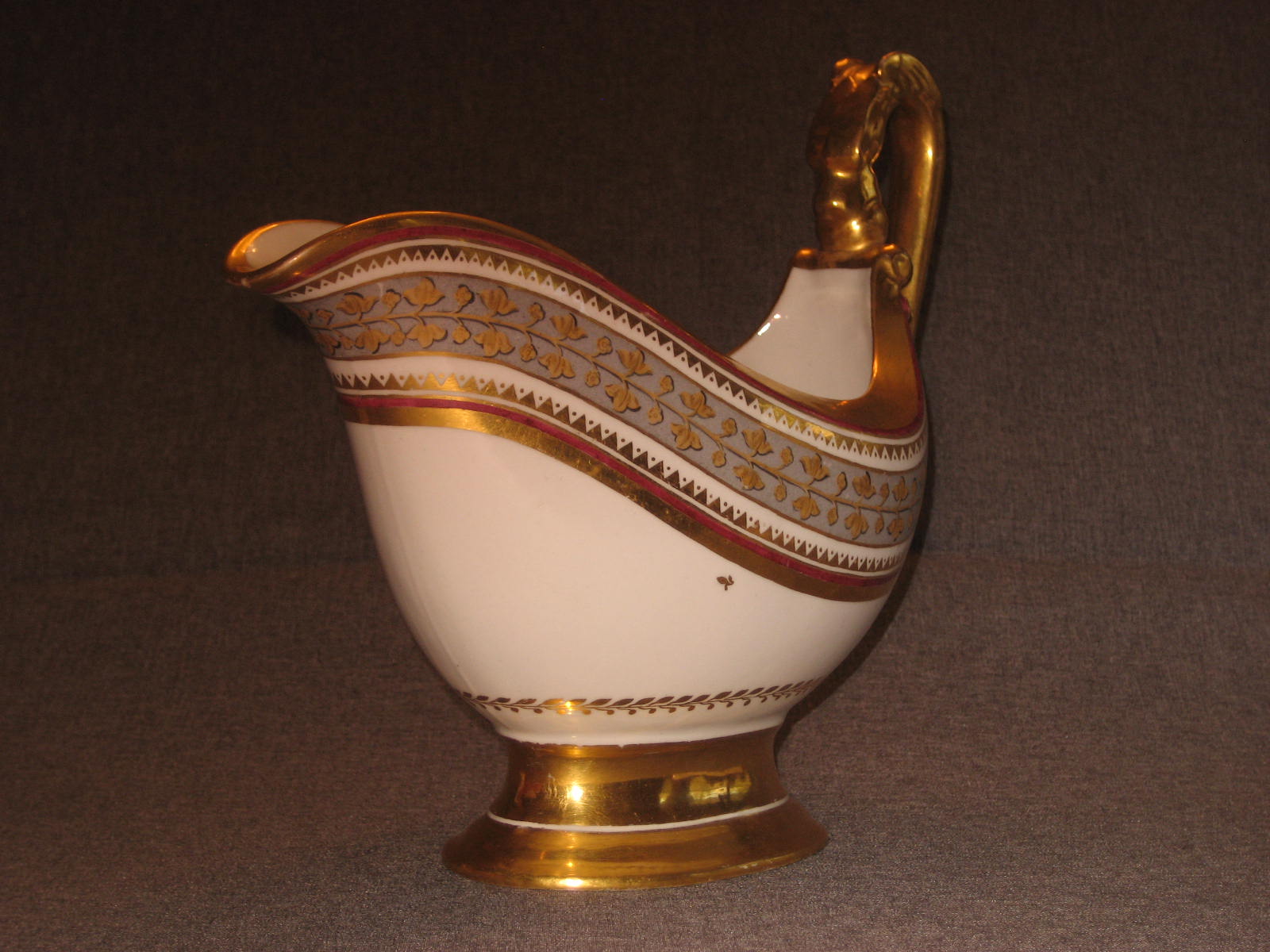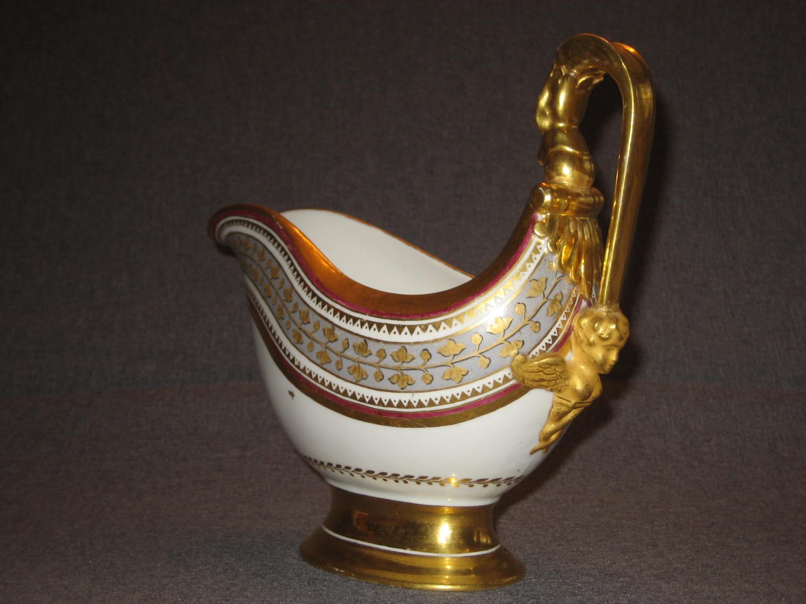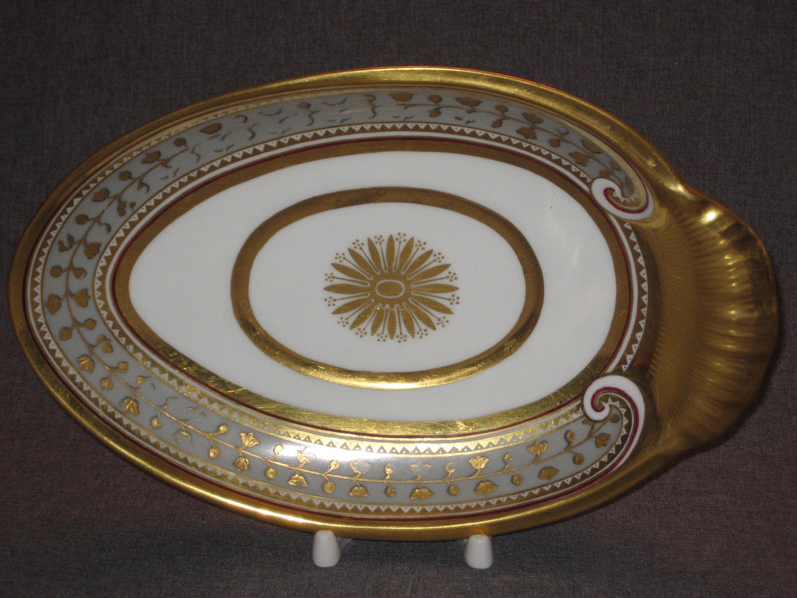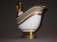 Соусник в комплекте с поддоном встречается очень редко. Поддон в идеальном состоянии. На соуснике произведена очень аккуратная склейка ручки. На фотографиях всё видно. В остальном соусник тоже находится в идеальном состоянии. Ни на соуснике, ни на поддоне даже позолота нигде не потёрта.