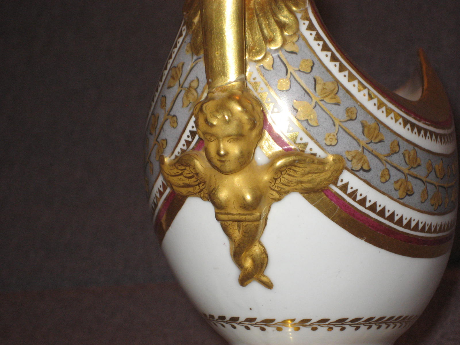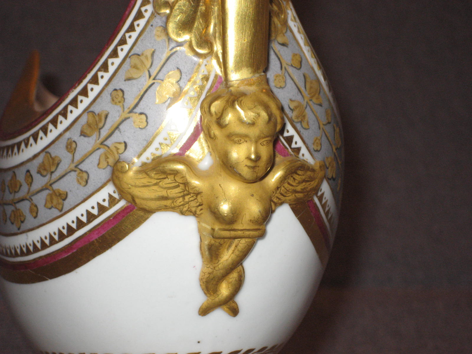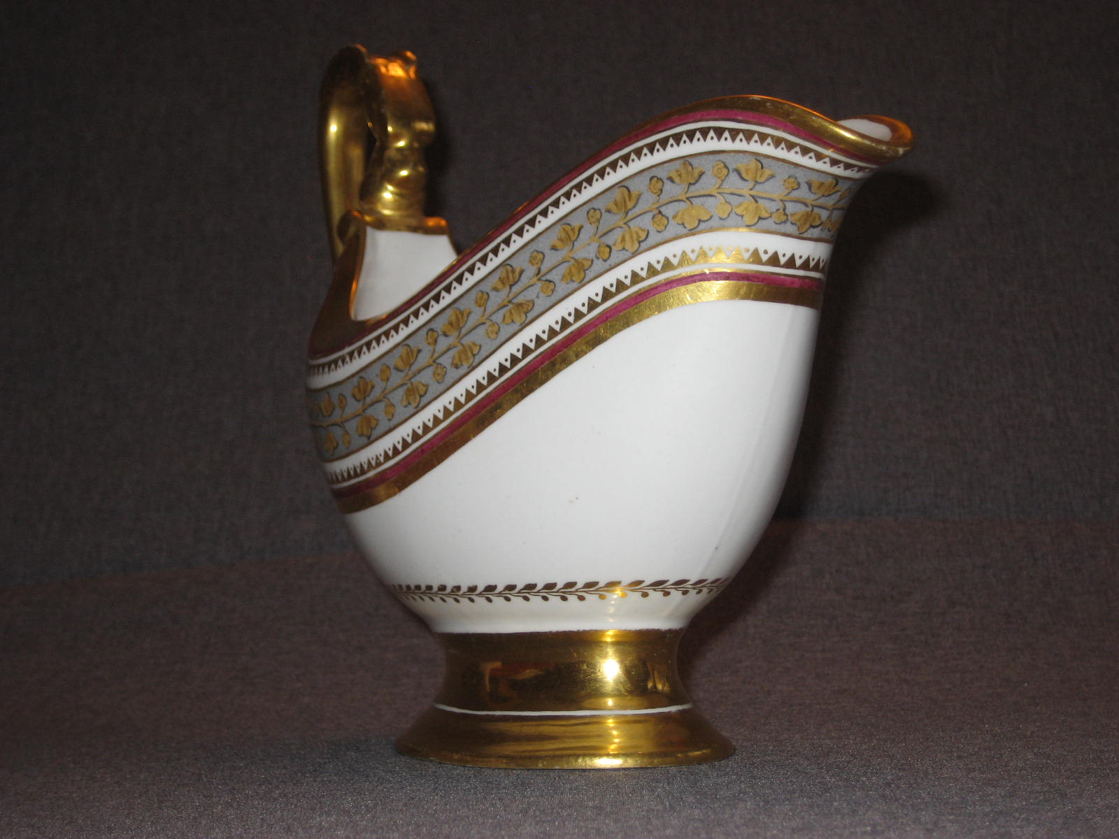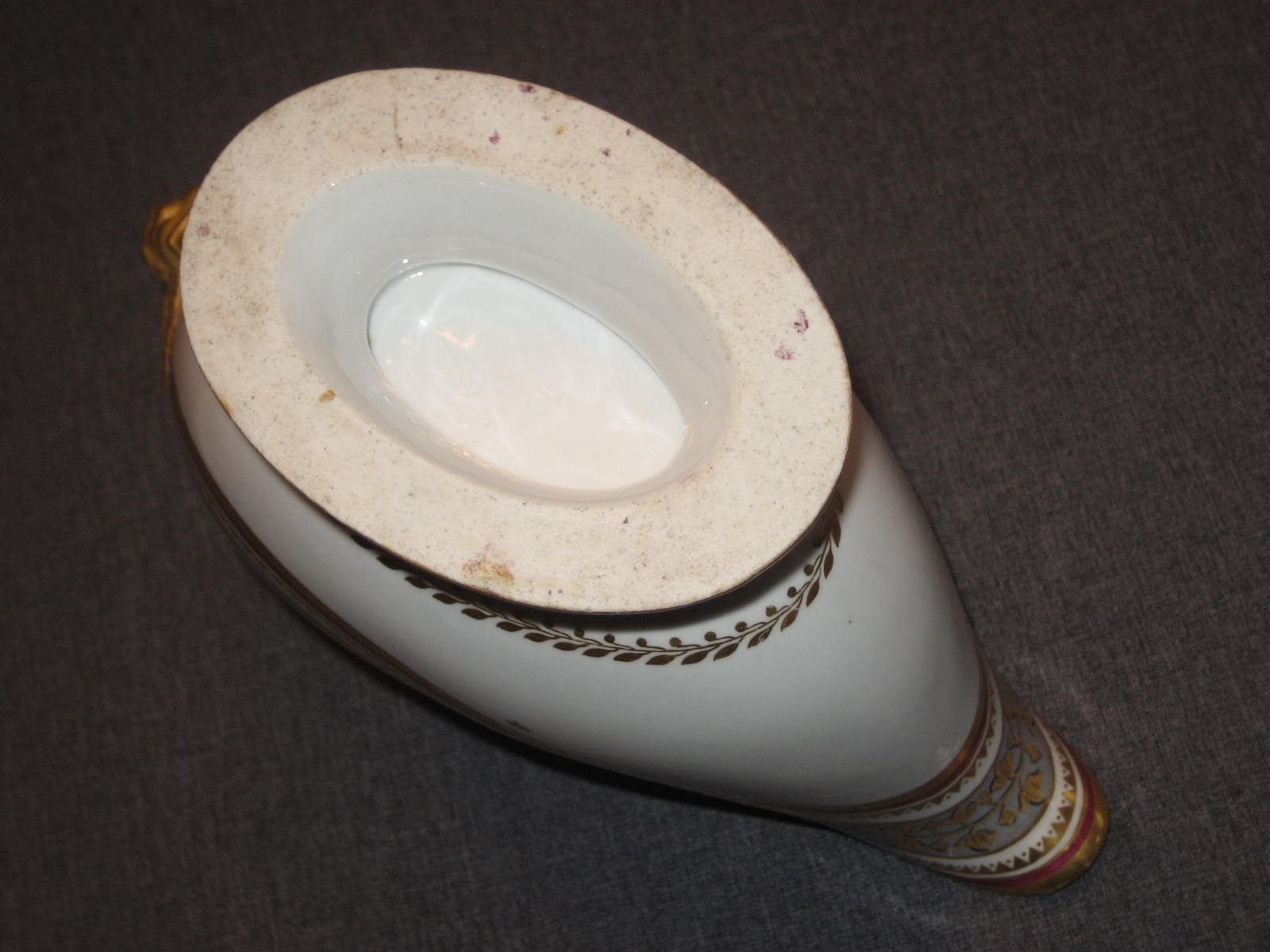 Соусник в комплекте с поддоном встречается очень редко. Поддон в идеальном состоянии. На соуснике произведена очень аккуратная склейка ручки. На фотографиях всё видно. В остальном соусник тоже находится в идеальном состоянии. Ни на соуснике, ни на поддоне даже позолота нигде не потёрта.