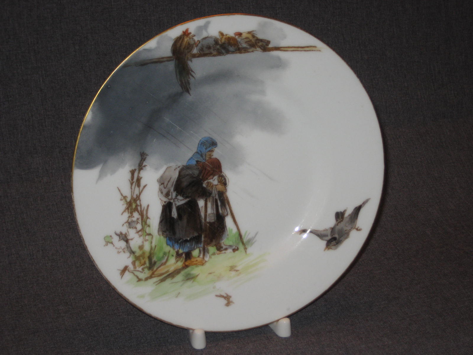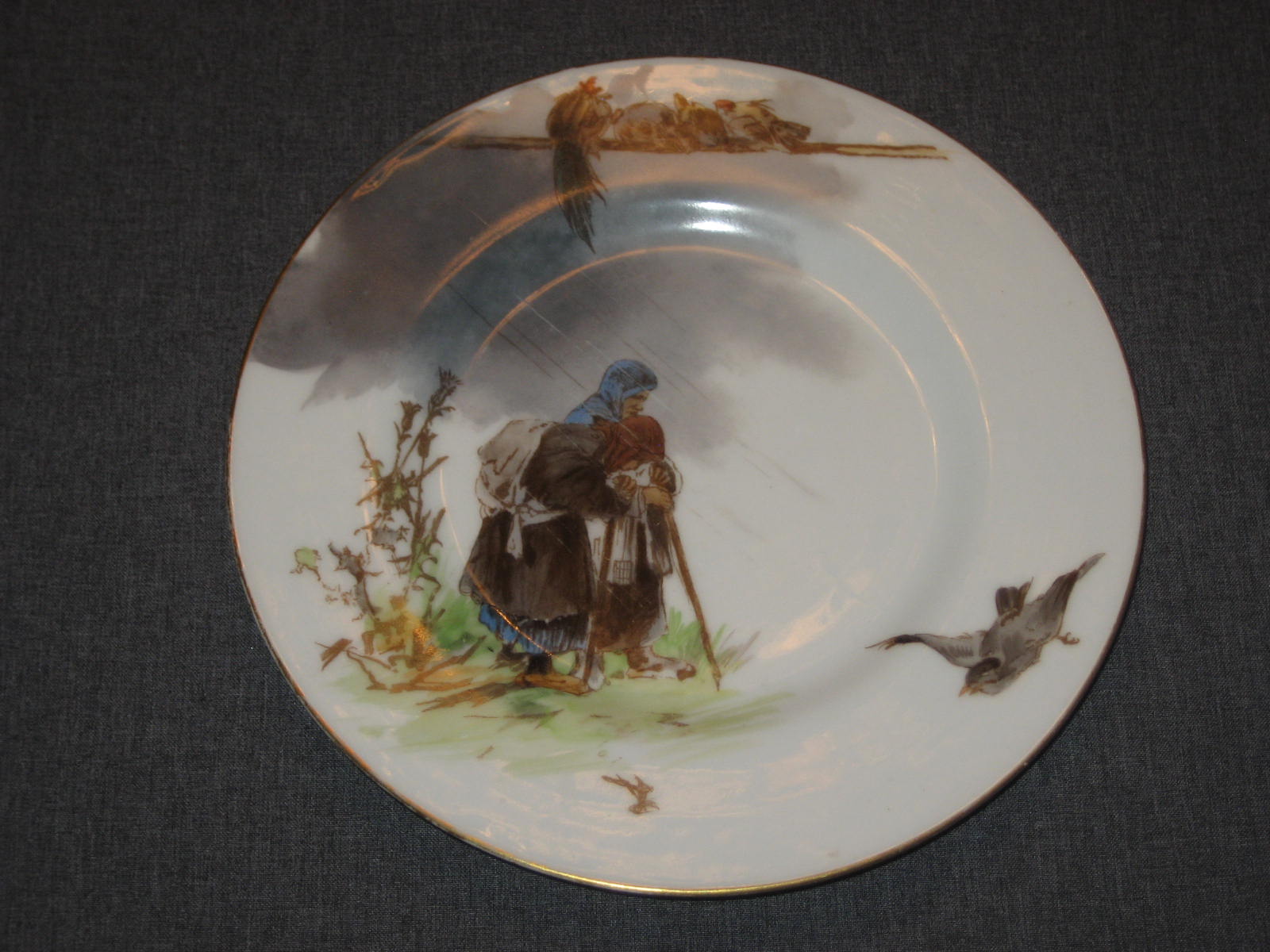 Тарелка с жанровой сценой из крестьянской жизни по рисунку Н.Н.Каразина (1842 - 1908). Хромолитография. Надпись красной краской: "Съ ориг. рисунка Н.Каразина. Воспроизведение запрещается". Состояние с фасадной стороны идеальное. С задней части тарелки присутствует скол, который не переходит на фасадную сторону (смотрите две последние фотографии).