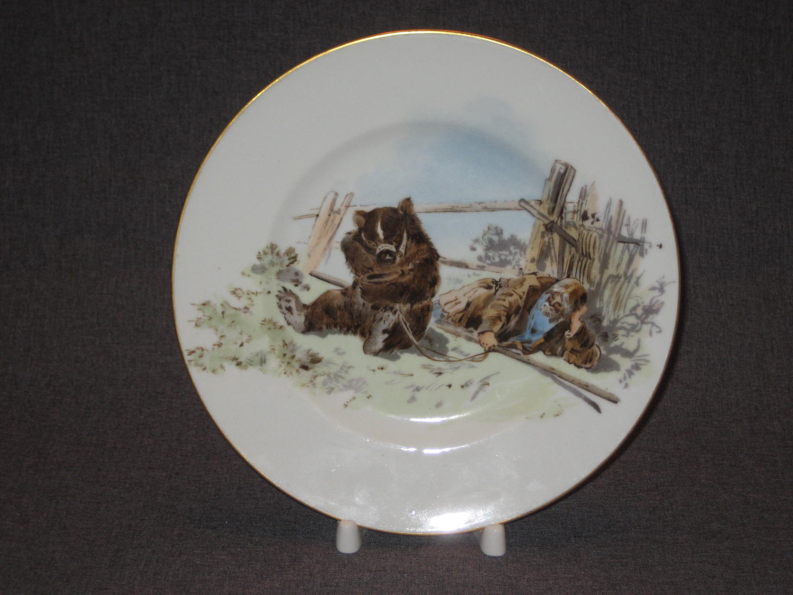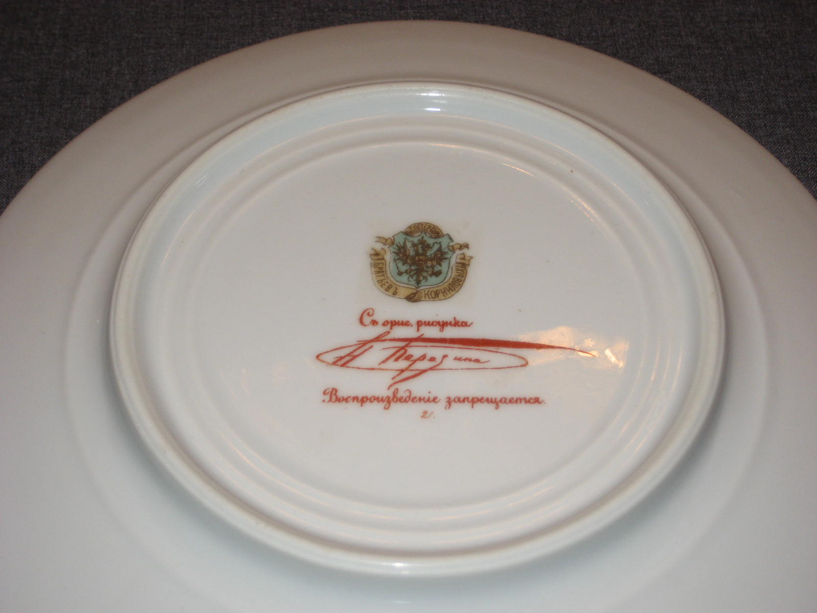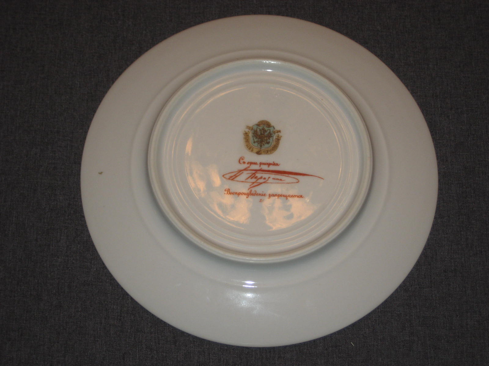 Тарелка с жанровой сценой из крестьянской жизни по рисунку Н.Н.Каразина (1842 - 1908). Хромолитография. Надпись красной краской: "Съ ориг. рисунка Н.Каразина. Состояние и на вид, и на ощупь идеальное. Но присутствует реставрация скола, которую я лично при покупке не заметил. Реставрацию видно только при очень сильном просвечивании насквозь. При слабом просвечивании, когда сам покупал эту тарелку, я эту реставрацию не увидел. На ощупь она так же не ощущается. Ну и, конечно, никакое фотографирование эту реставрацию не передаст.