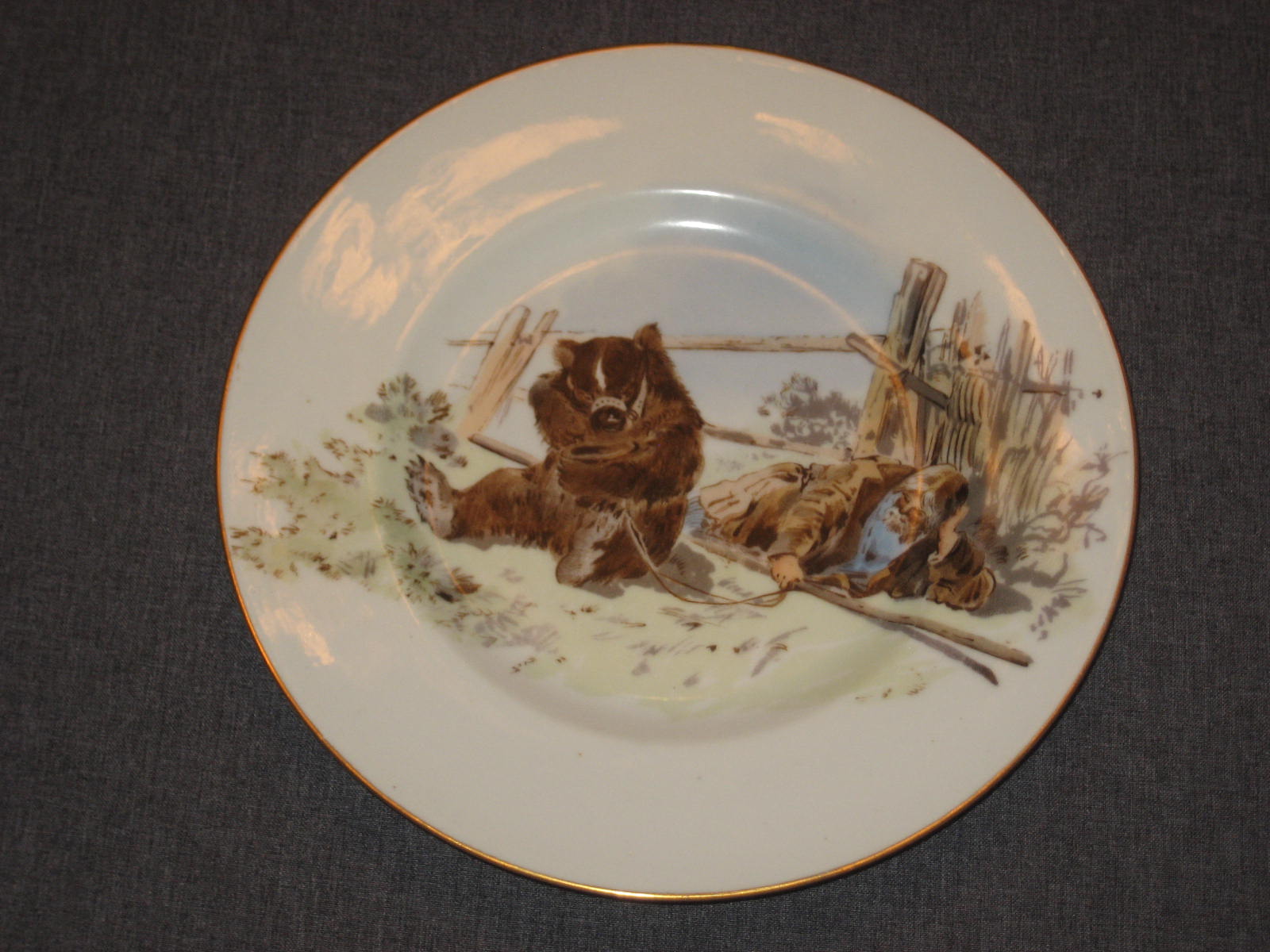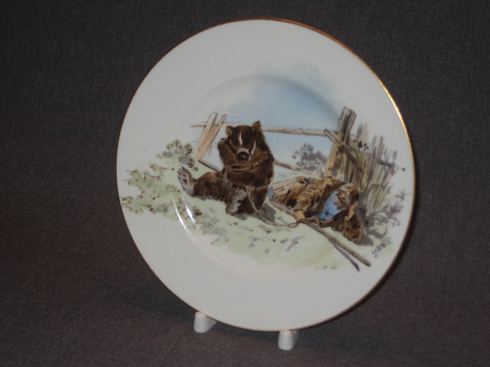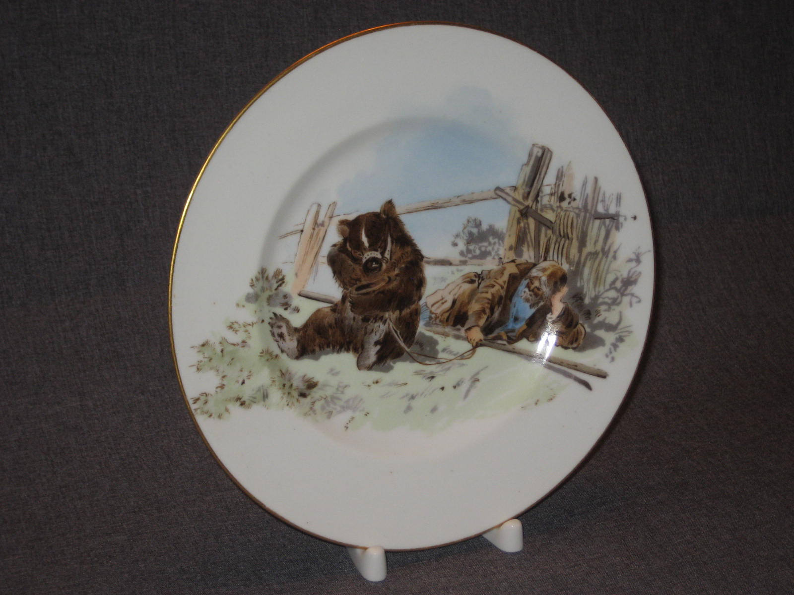 Тарелка с жанровой сценой из крестьянской жизни по рисунку Н.Н.Каразина (1842 - 1908). Хромолитография. Надпись красной краской: "Съ ориг. рисунка Н.Каразина. Состояние и на вид, и на ощупь идеальное. Но присутствует реставрация скола, которую я лично при покупке не заметил. Реставрацию видно только при очень сильном просвечивании насквозь. При слабом просвечивании, когда сам покупал эту тарелку, я эту реставрацию не увидел. На ощупь она так же не ощущается. Ну и, конечно, никакое фотографирование эту реставрацию не передаст.