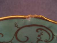 Тарелка находится в очень хорошем состоянии. Присутствуют только небольшие потёртости крытья и подкрашивание позолоты на торце тарелки (смотрите последнее фото). При этом никакой реставрации в этом месте при помощи различных вспомогательных средств не обнаружено.