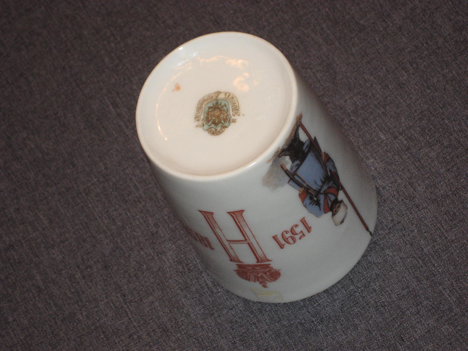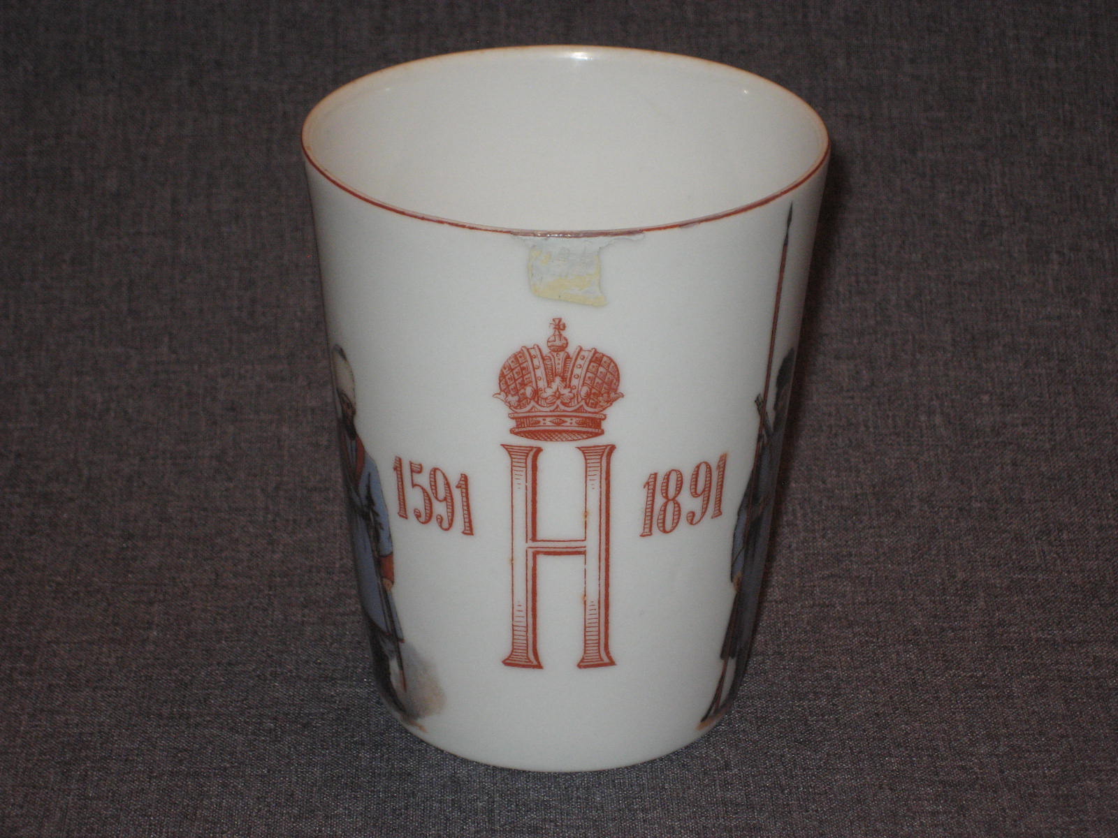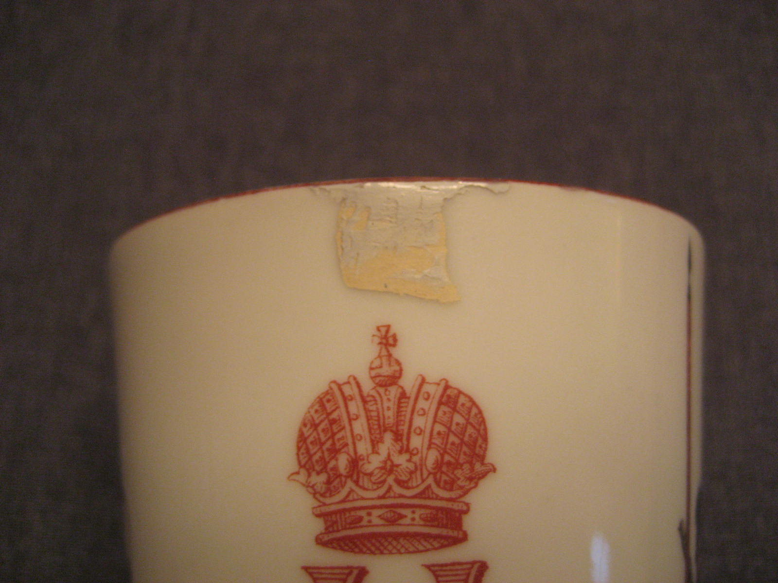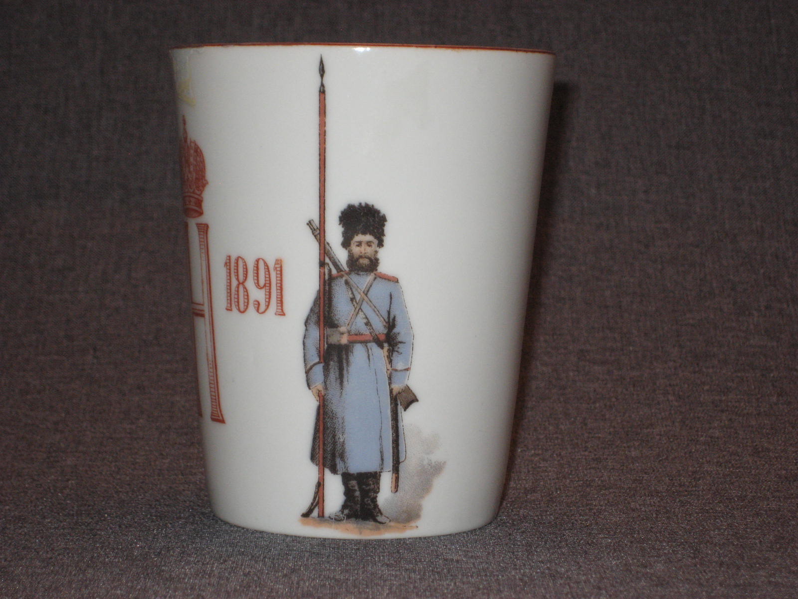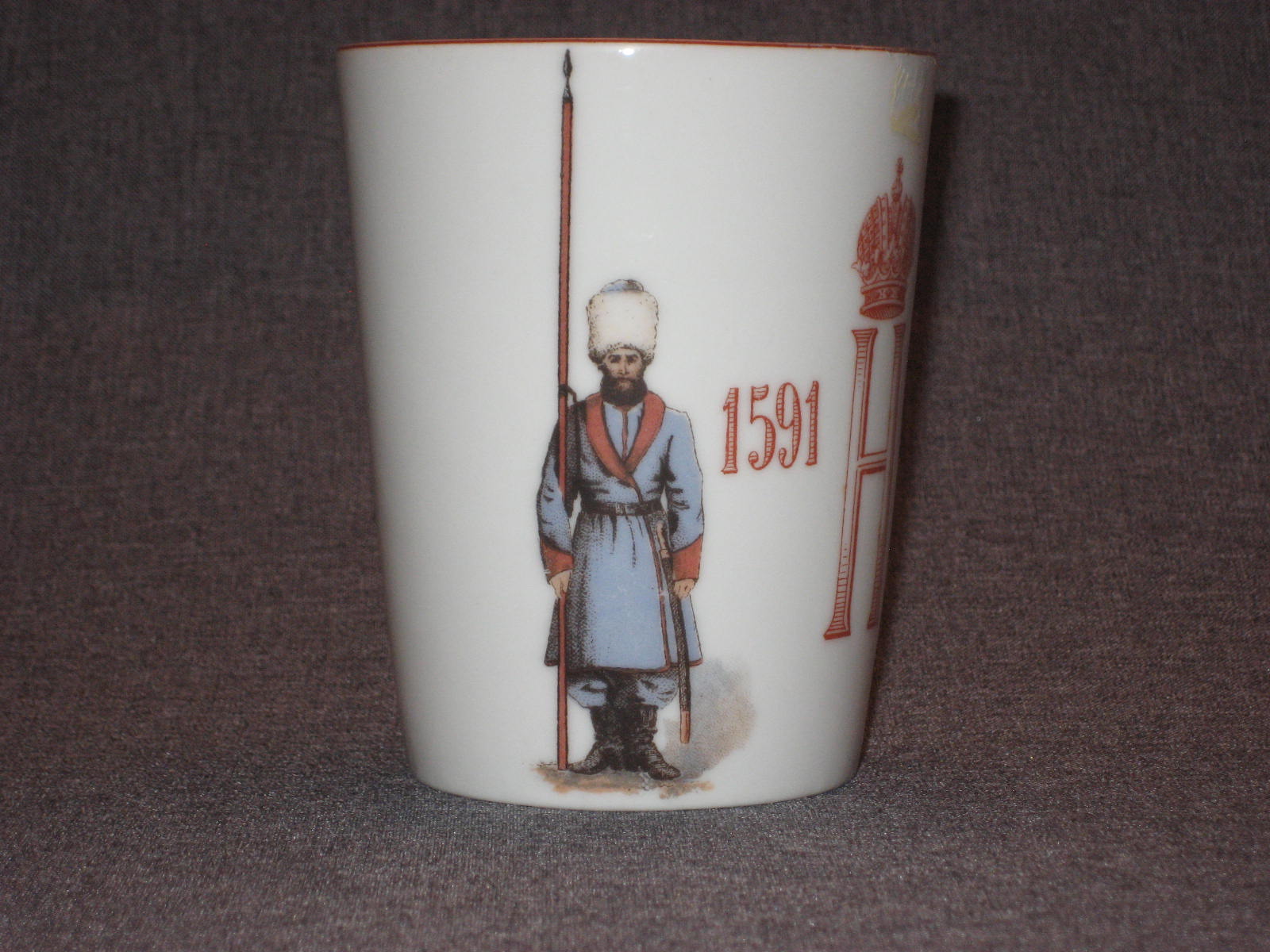 Сувенирный стакан в честь 300-летия старшинства Лейб-Гвардии Уральского казачьего войска. Печать надглазурная полихромная, позолота. Реставрация скола. Скол только на наружной части. На внутренней части и торце скола нет. Смотрите фото. В остальном состояние хорошее. Других дефектов нет. По Вашему запросу вышлем Вам дополнительные фотографии.