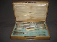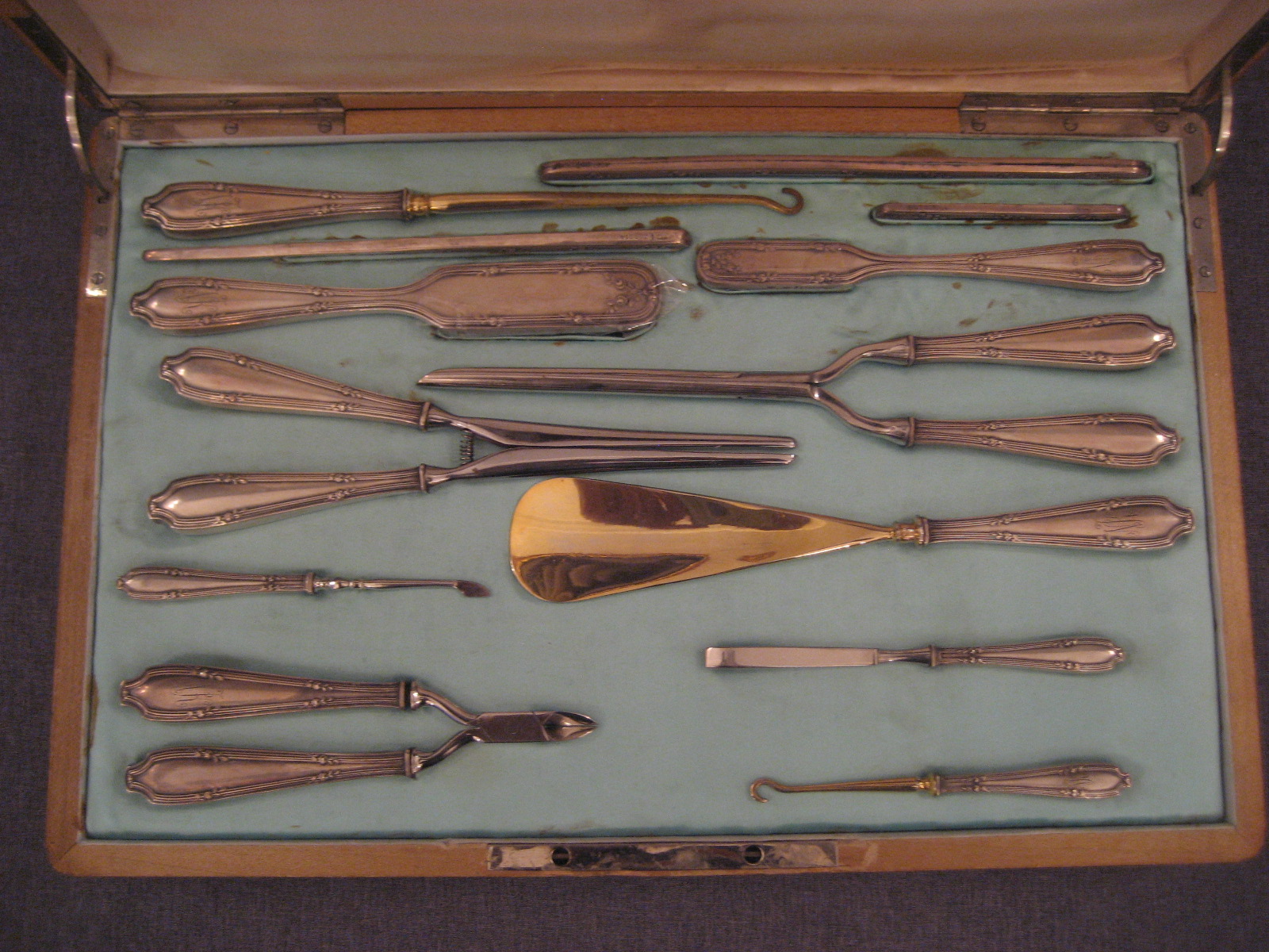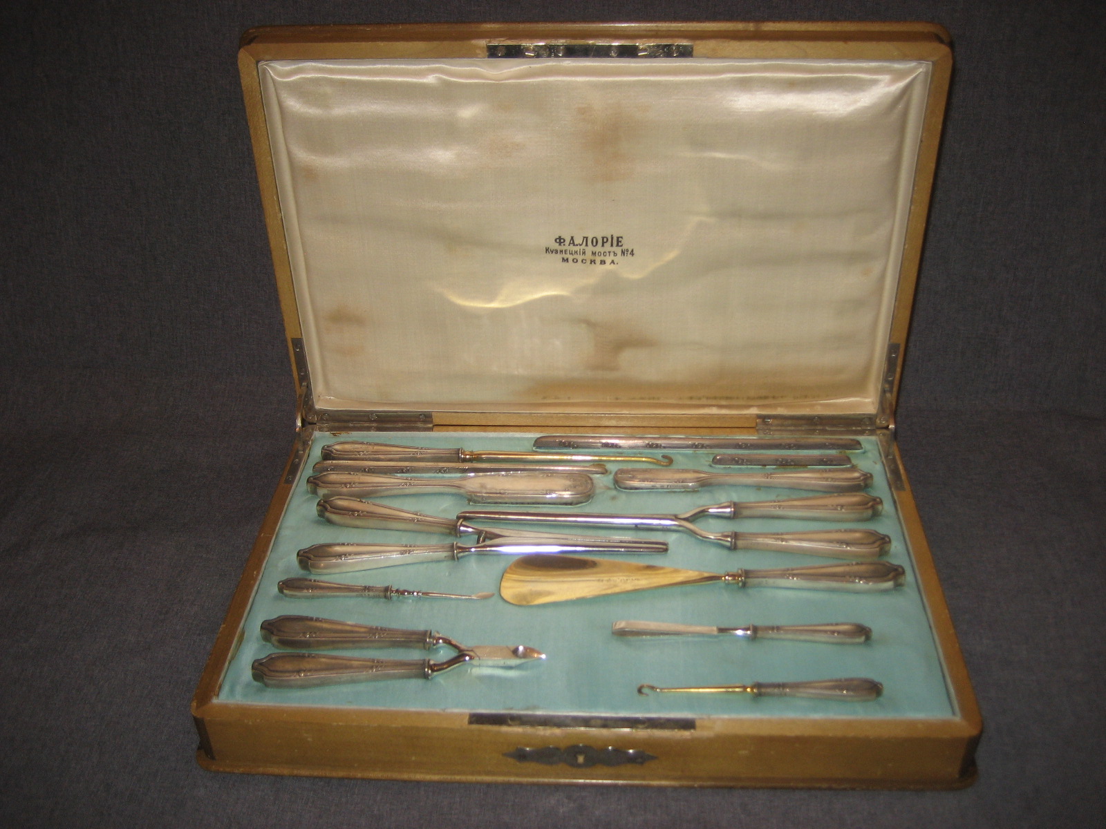 Привозной, видимо, Германский набор, все предметы которого опробированы ввозной таможенной 84-ой пробой, в оригинальном деревянном ящике. Всё, в том числе и коробка, в отличном состоянии. Утерян ключ, но, при желании, подобрать ключ не является большой проблемой. По Вашему запросу вышлем Вам дополнительные фотографии.