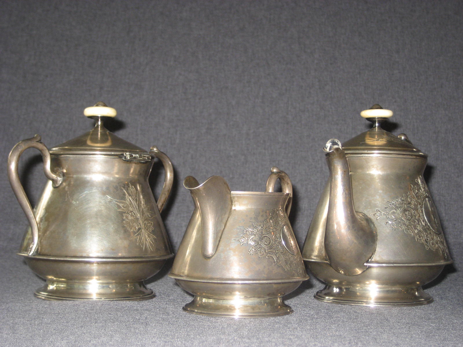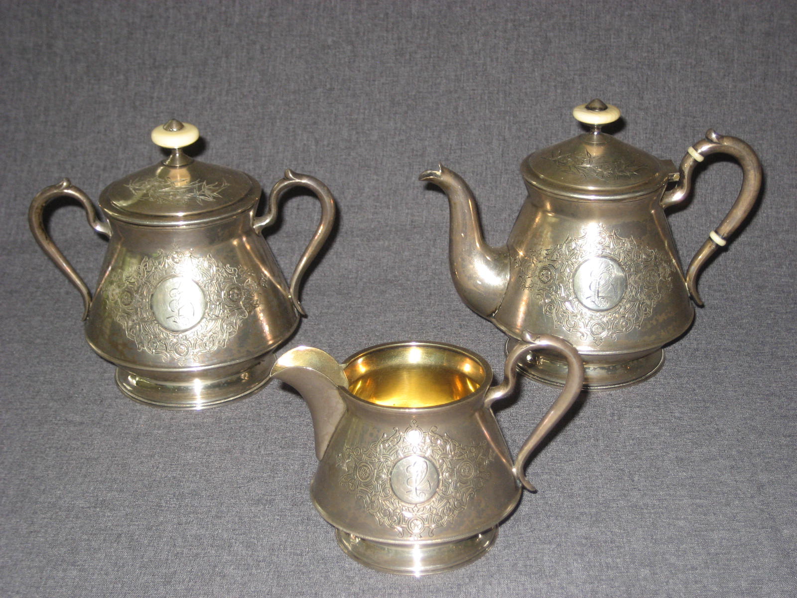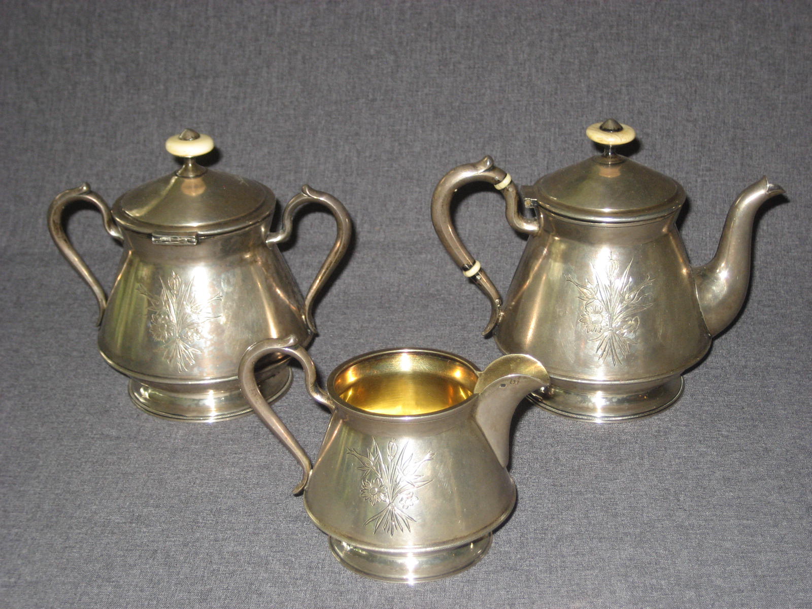 Пробирный инспектор Иван Лебёдкин. Мастер И.П. Дефектов нет. Вес: Чайник 338 гр. Сахарница 314 гр. Сливочник 149гр. Пробы стоят на всех частях. При необходимости вышлю Вам любые дополнительные фотографии.